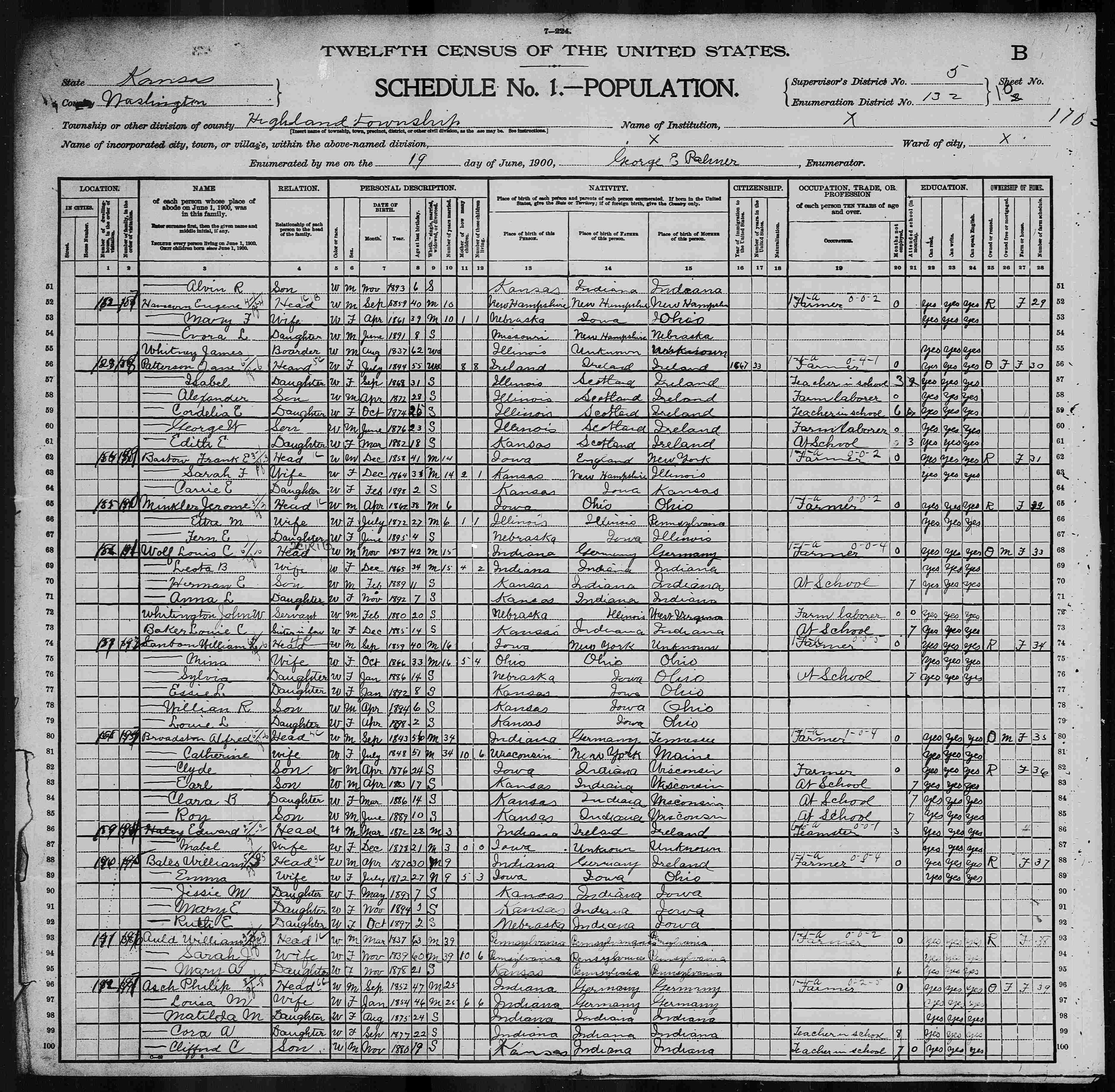6198. “United States Census: 1900,” Bureau of the Census, US Dept. of Commerce, United States of America, 1900, KS, Washington, Highland Township, June 19, 1900, George E Palmer, 10B, 5, 132, T623, 503, 72.