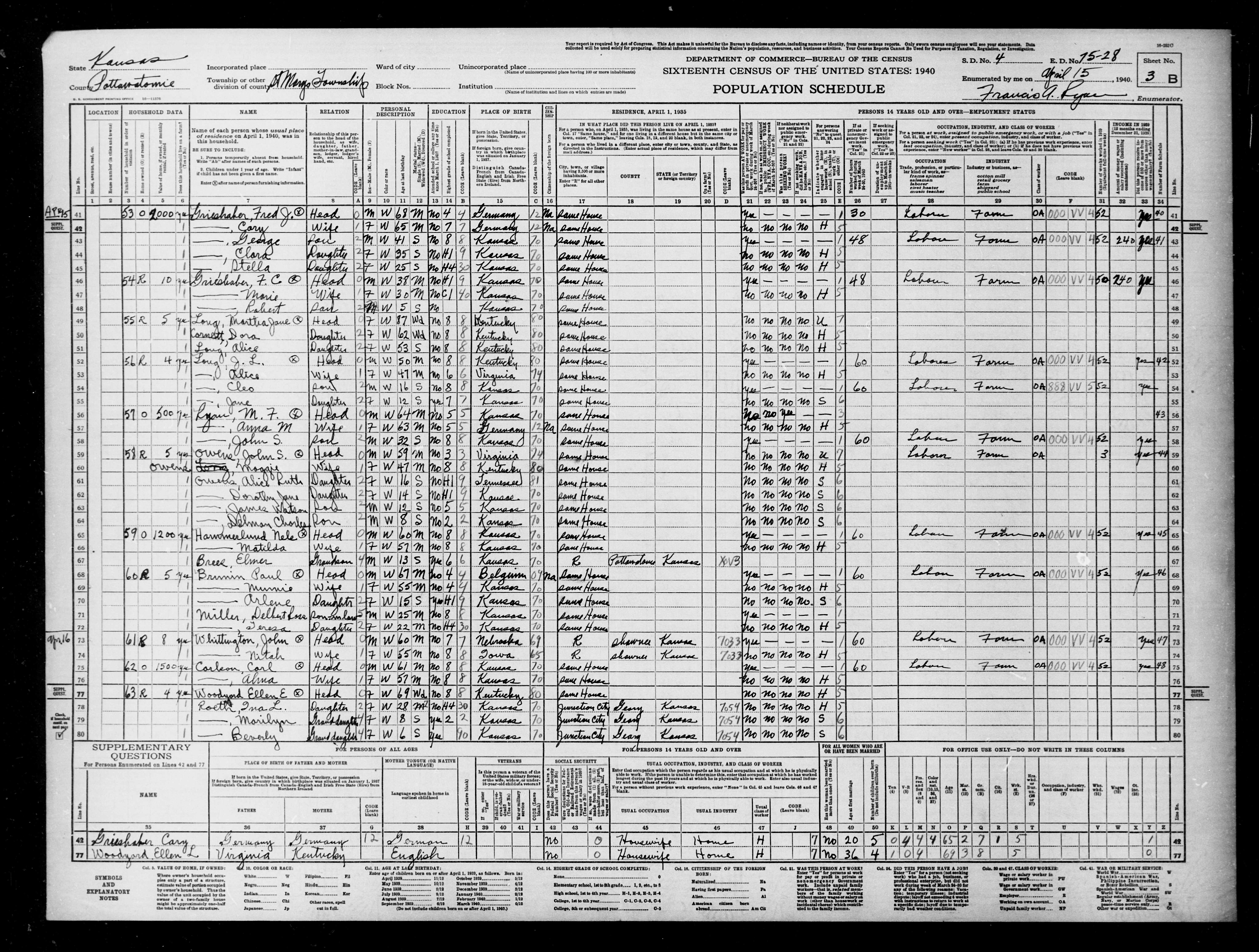 6200. “United States Census: 1940,” Bureau of the Census, US Dept. of Commerce, United States of America, 1940, KS, Pottawatomie, St Mary’s, April 16, 1940, Francis A Ryan, 3B, 4, 82-9A75-28, T627, 1252, 325.