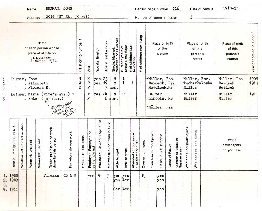 6362. “Census of the German-Russian Population of Lincoln, Nebraska,” Hattie Plum Williams and Jacob J. Stroh, 1914, NE, Lancaster, Lincoln, 2016 “N” St., 116, http://freepages.genealogy.rootsweb.ancestry.com/~.../lincolncensusp2.jpg, Lists coming to Lincoln in 1913, which cannot be correct since she is in Lincoln during the the 1910 census with an immigration year of 1909 (which does agree with this document).