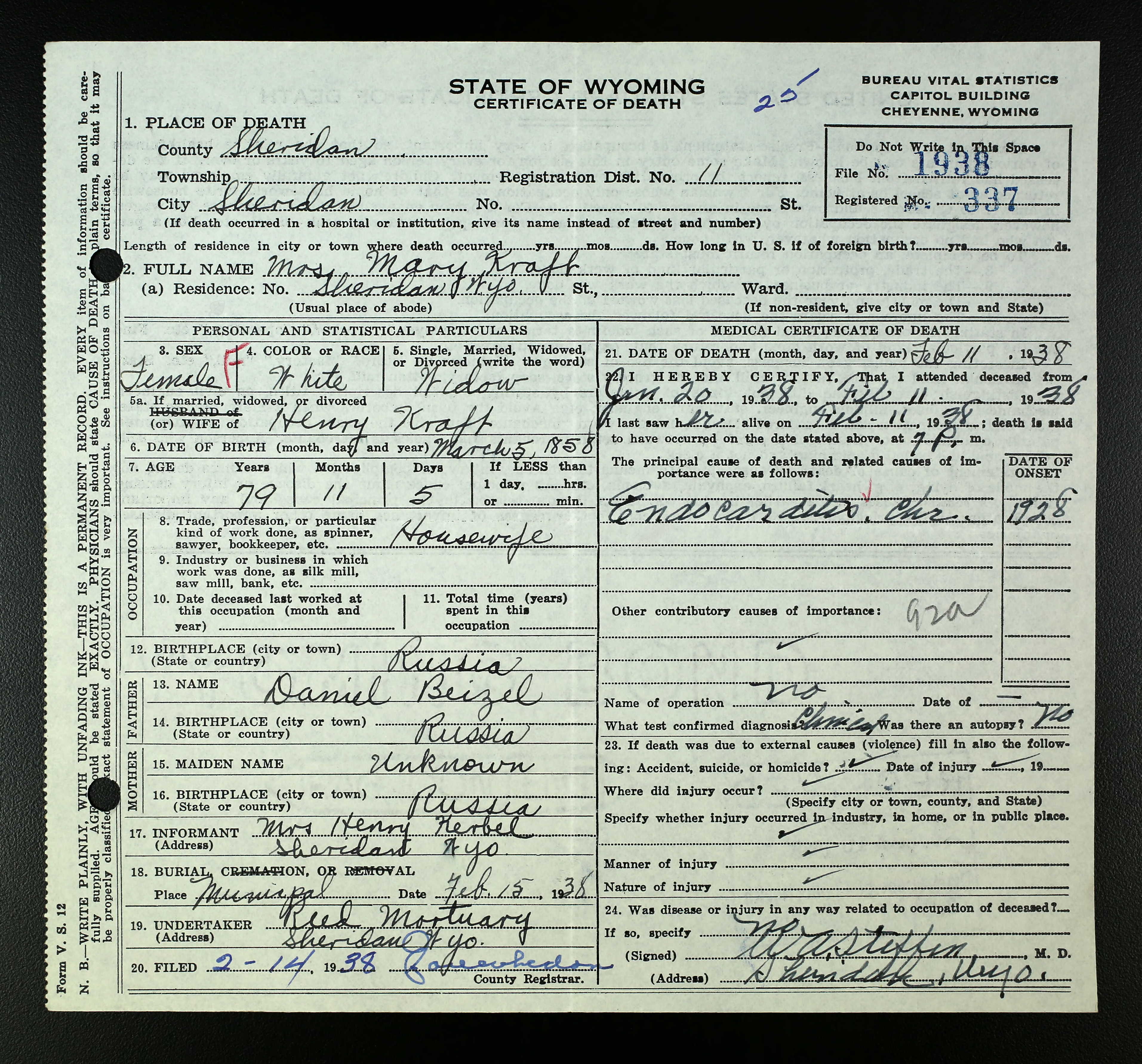 6361. Mary Beisel Kraft, “Wyoming Death Records,” February1, 1938, Sheridan, Sheridan County, WY.