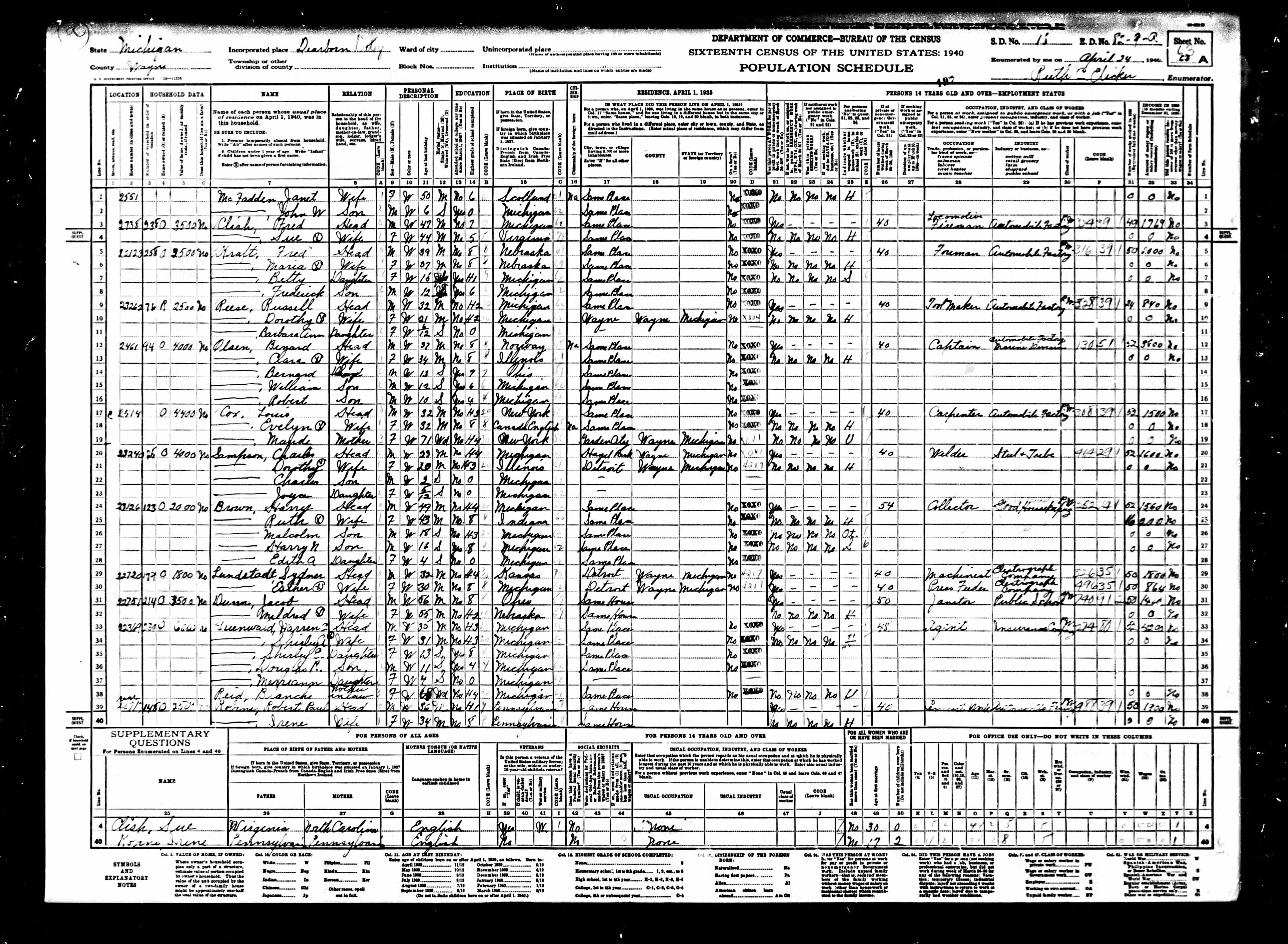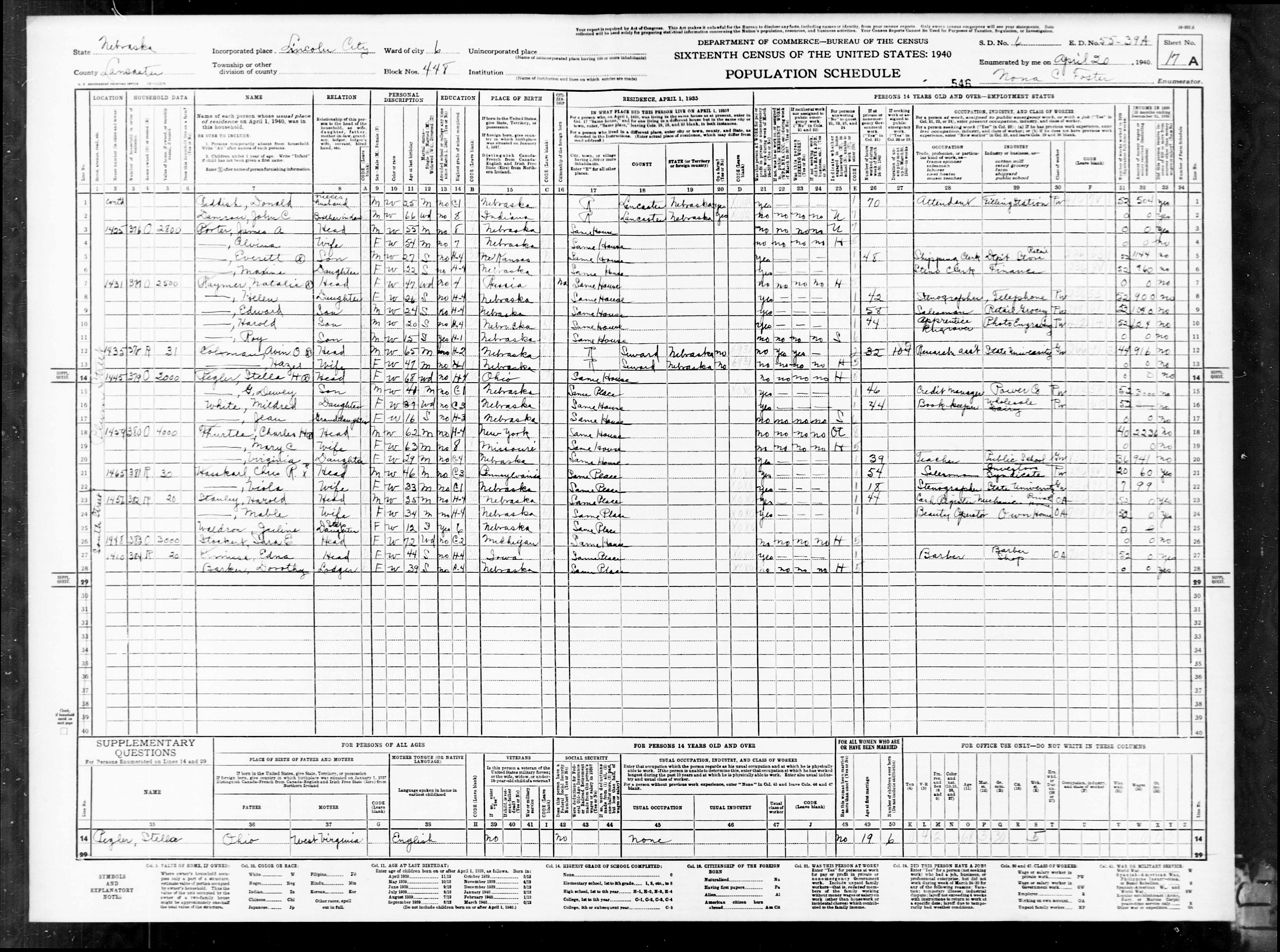 6368. “United States Census: 1940,” Bureau of the Census, US Dept. of Commerce, United States of America, 1940, NE, Lancaster, Lincoln, Ward 6, April 20, 1940, Nona C Foster, 17A, 6, 55-39A, T627, 2254, 126.