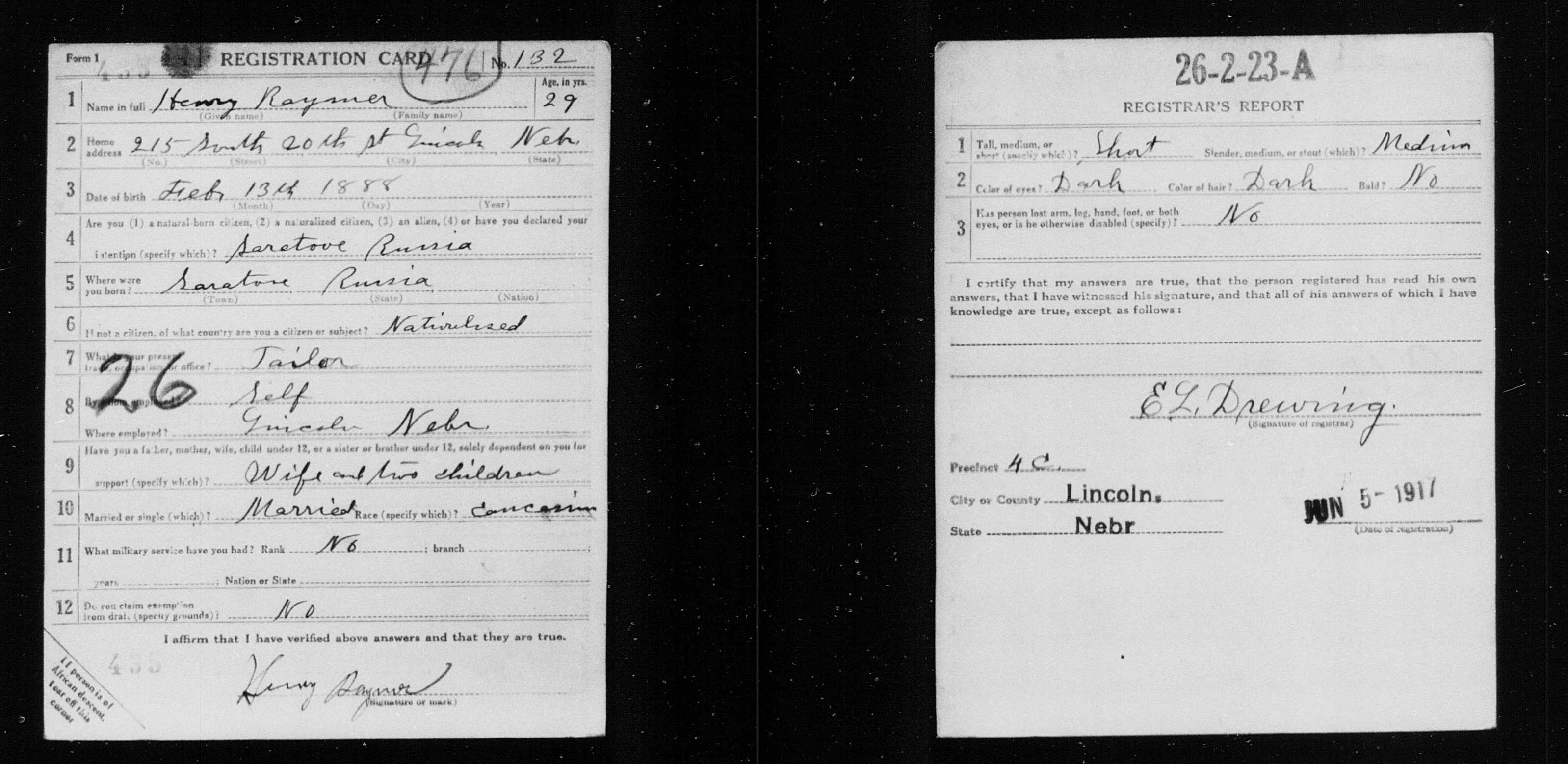 6370. World War I, 1917, Nebraska, 435, Raymer, Henry, “World War I Selective Service System Draft Registration Cards,” June 5, 1917, Lincoln, Lancaster County, NE, USA, Affiliate Publication Number: M1509 , GS Film Number: 001711703 , Digital Folder Number: 005253444 , Image Number: 03992, https://familysearch.org/pal:/MM9.1.1/29JN-1KT.