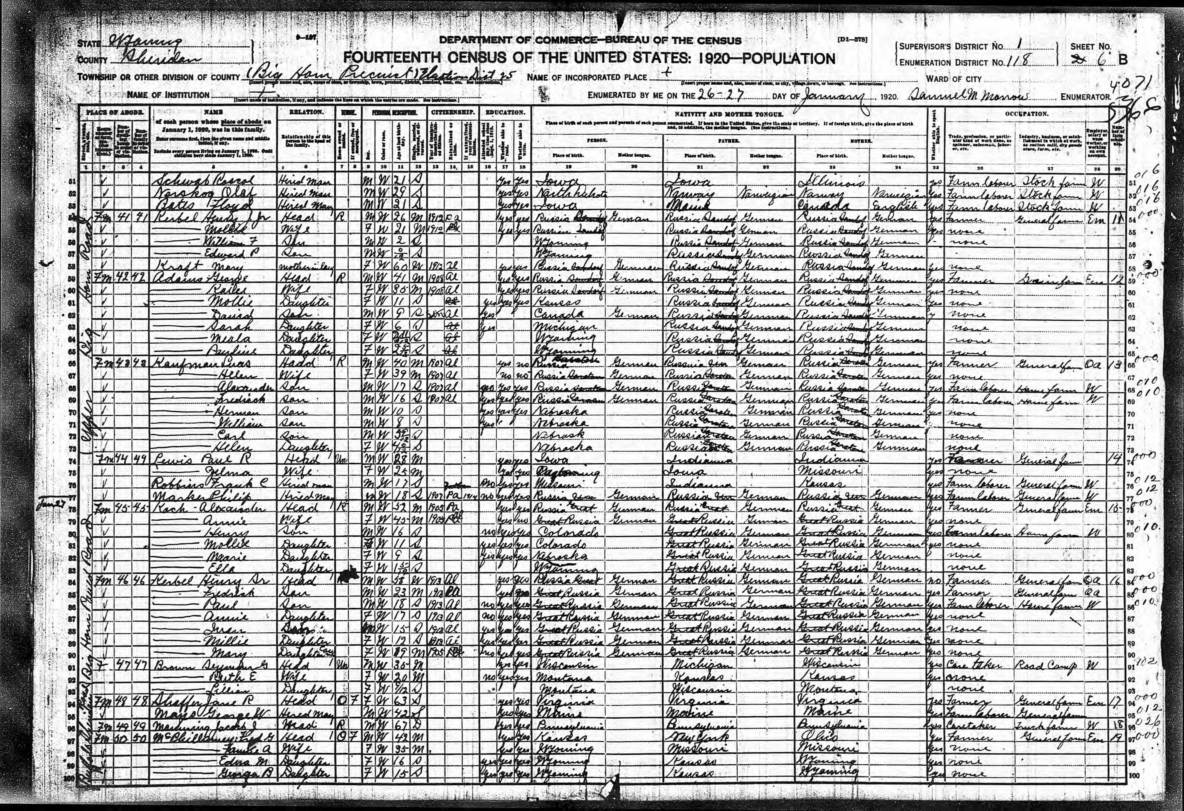 6380. “United States Census: 1920,” Bureau of the Census, US Dept. of Commerce, United States of America, 1920, WY, Sheridan, Big Horn, January 26, 1920, Samuel M Morrows, 6B, 1, 118, T625, 2029, 312.