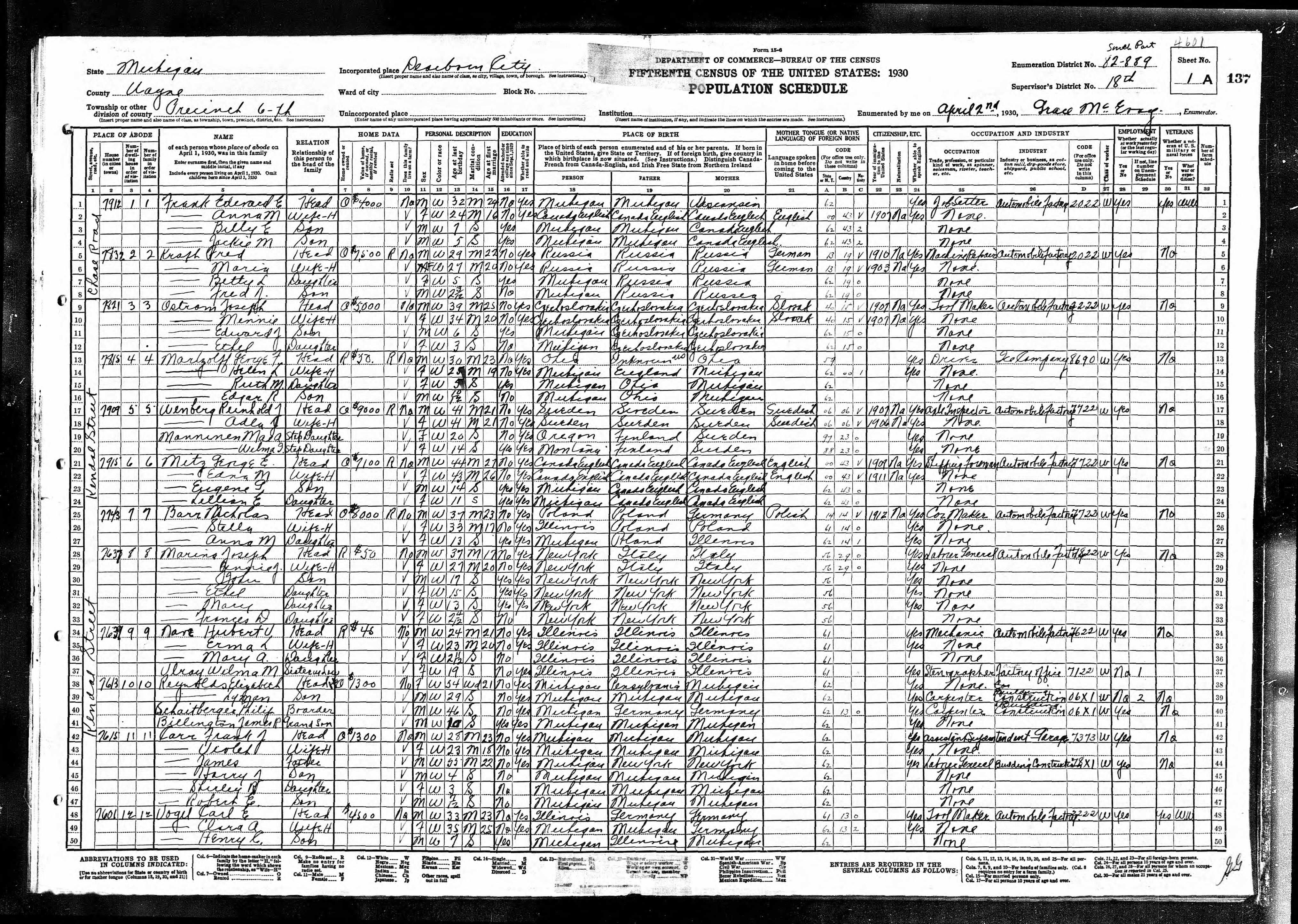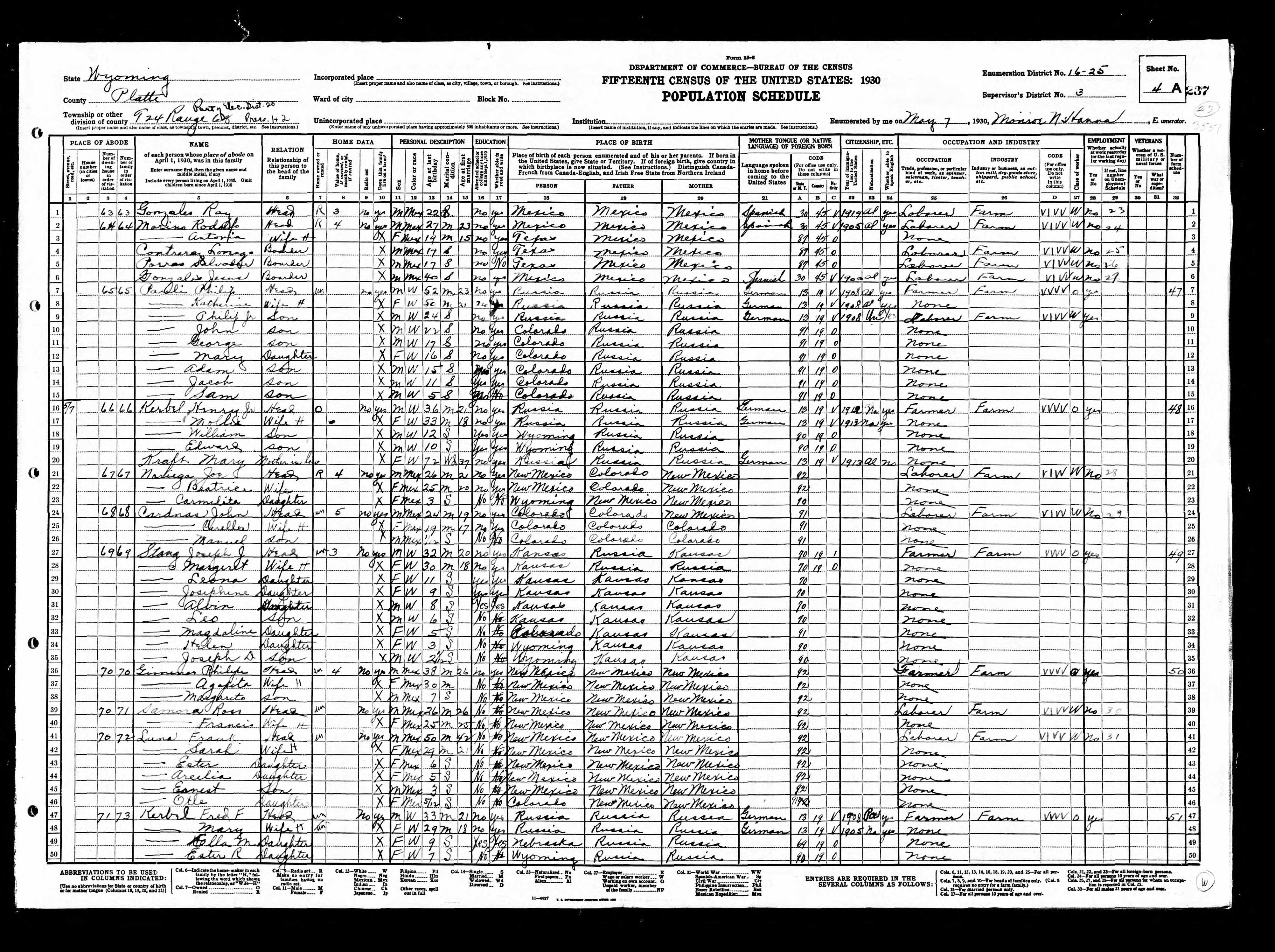 6381. “United States Census,” 1930, WY, Platte, Electoral District 20, 4A, 3, 16-25, T626, 2623, 1066, Bureau of the Census, US Dept. of Commerce, United States of America, May 7, 1930, Marion N Hanna.