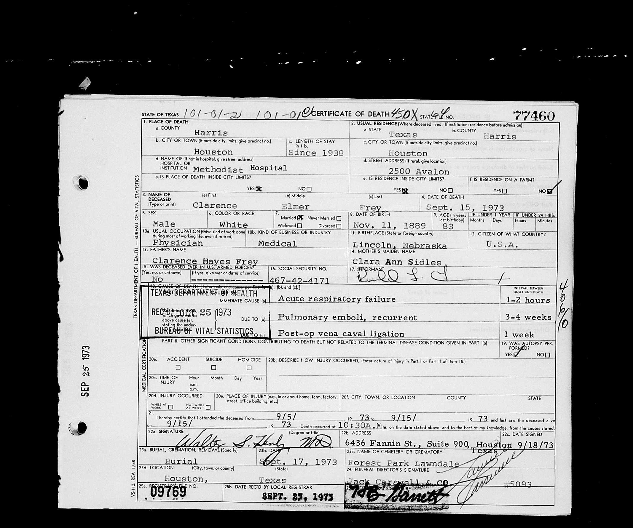 6405. Clarence Elmer Frey, “Texas, Deaths, 1890-1976,” September 15, 1973, Houston, Harris County, TX, GS Film number: 2242914 , Digital Folder Number: 005145841 , Image Number: 02013, https://familysearch.org/ark:/61903/1:1:K3DH-FFV.