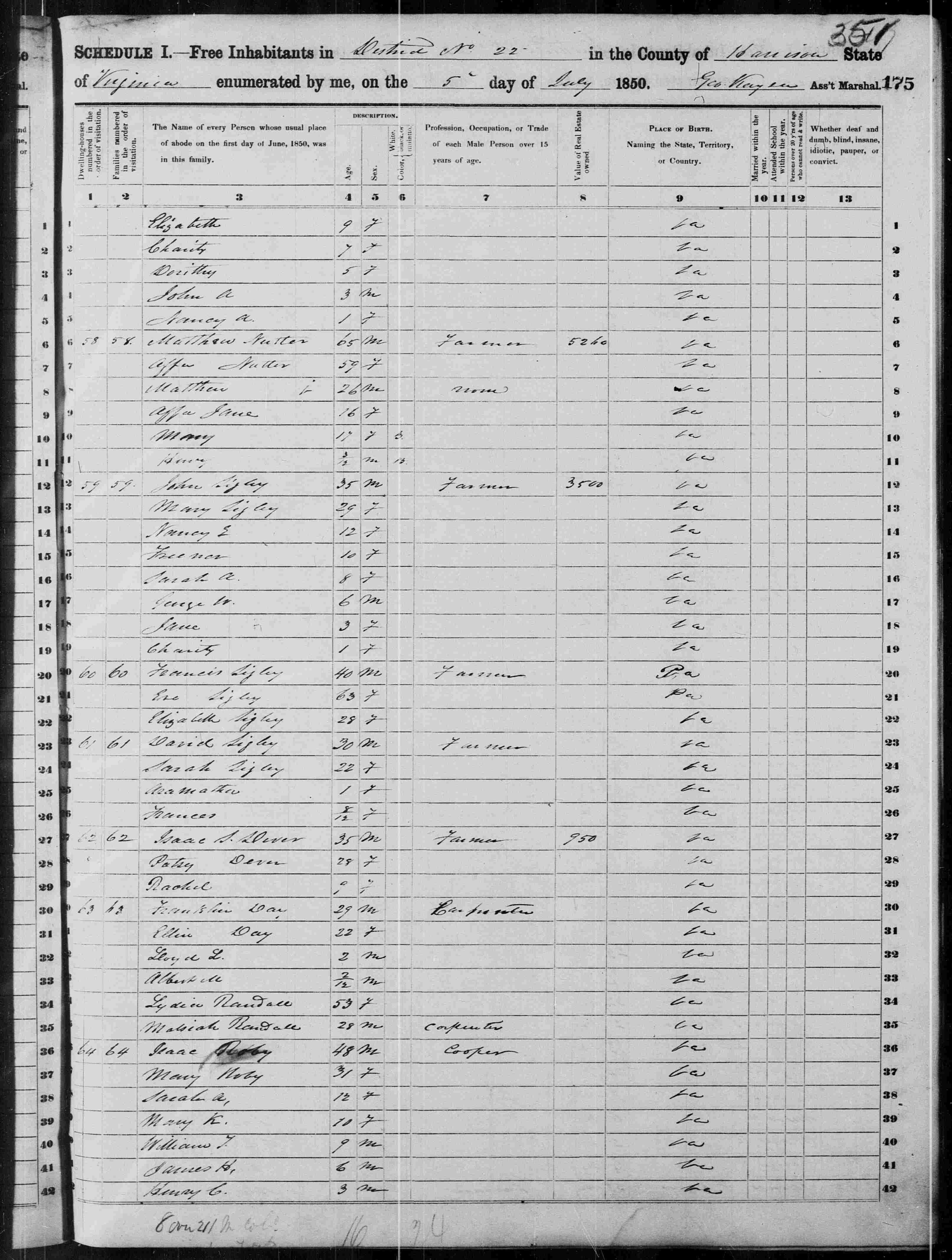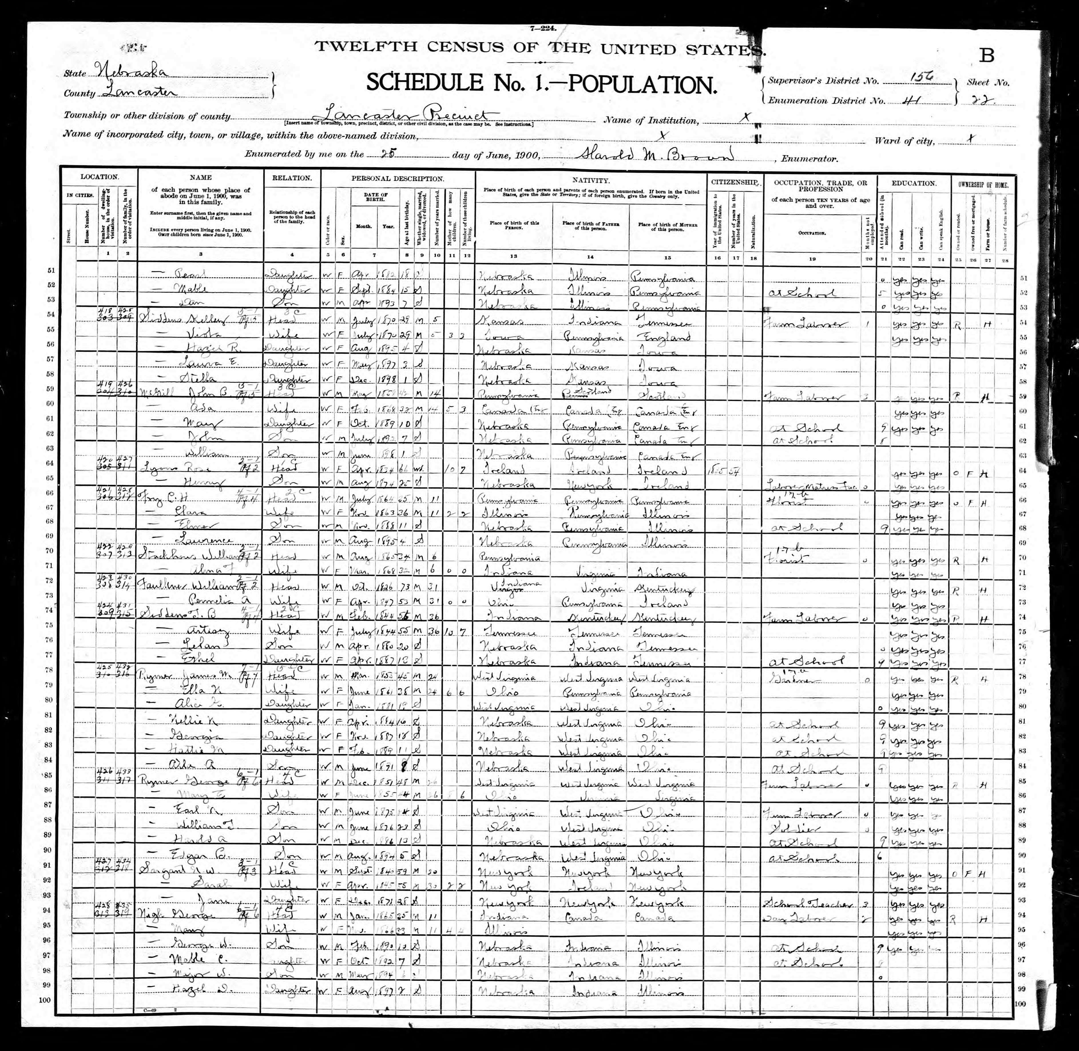 6406. “United States Census,” 1900, NE, Lancaster, Lancaster Precinct, 22B, 156, 41, T623, 932, 43, Bureau of the Census, US Dept. of Commerce, United States of America, June 25, 1900, Harold M Brown.
