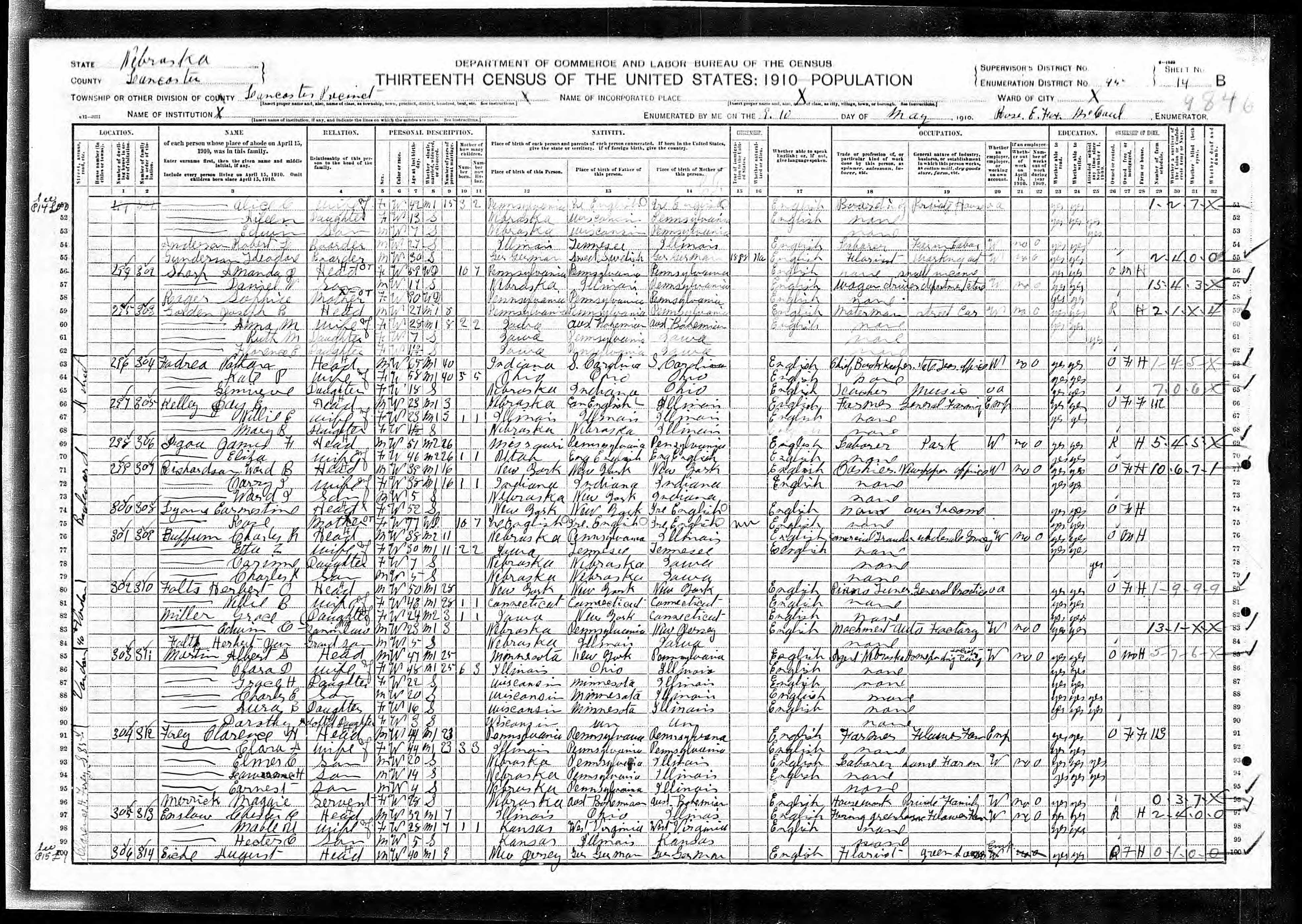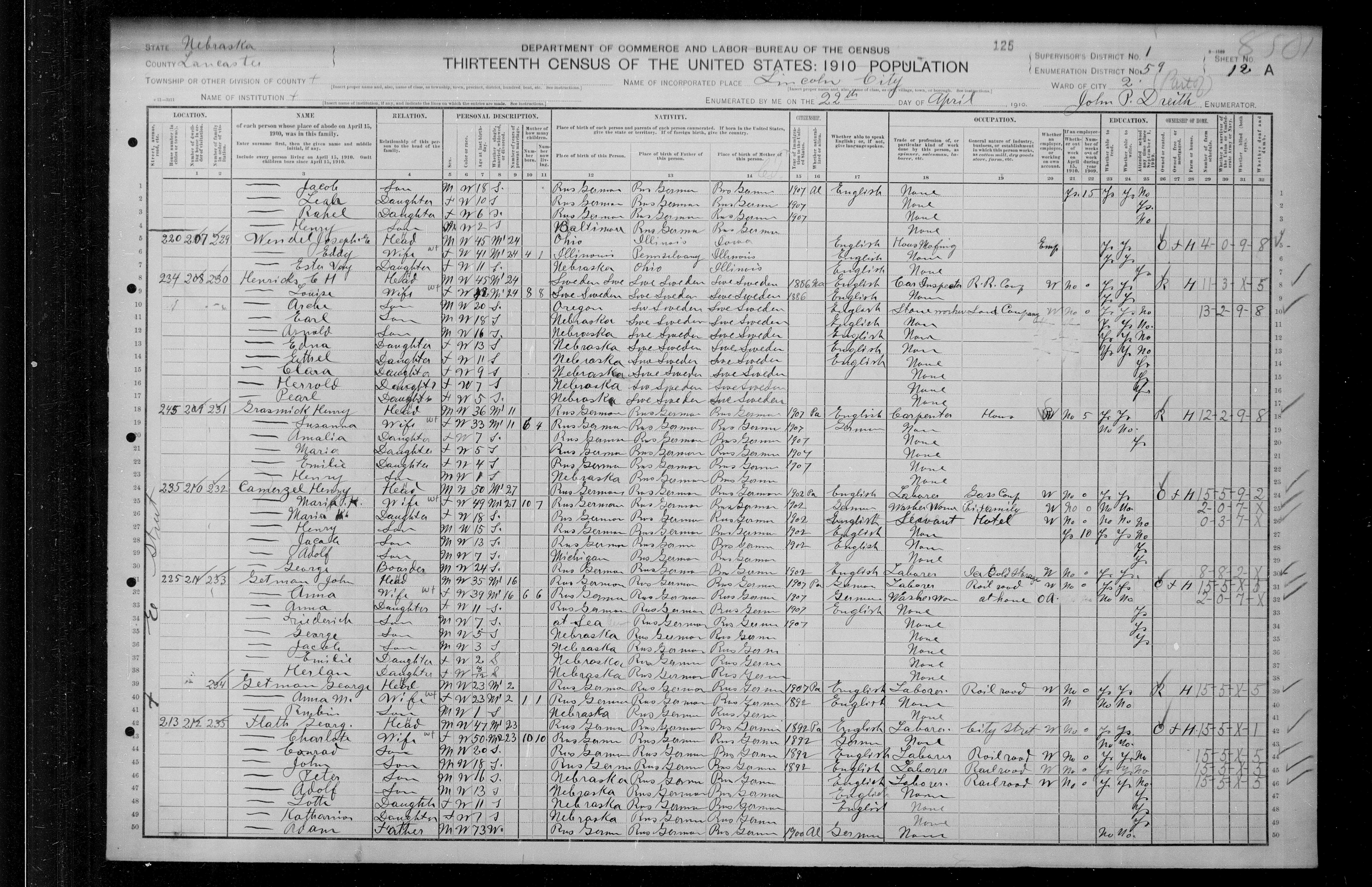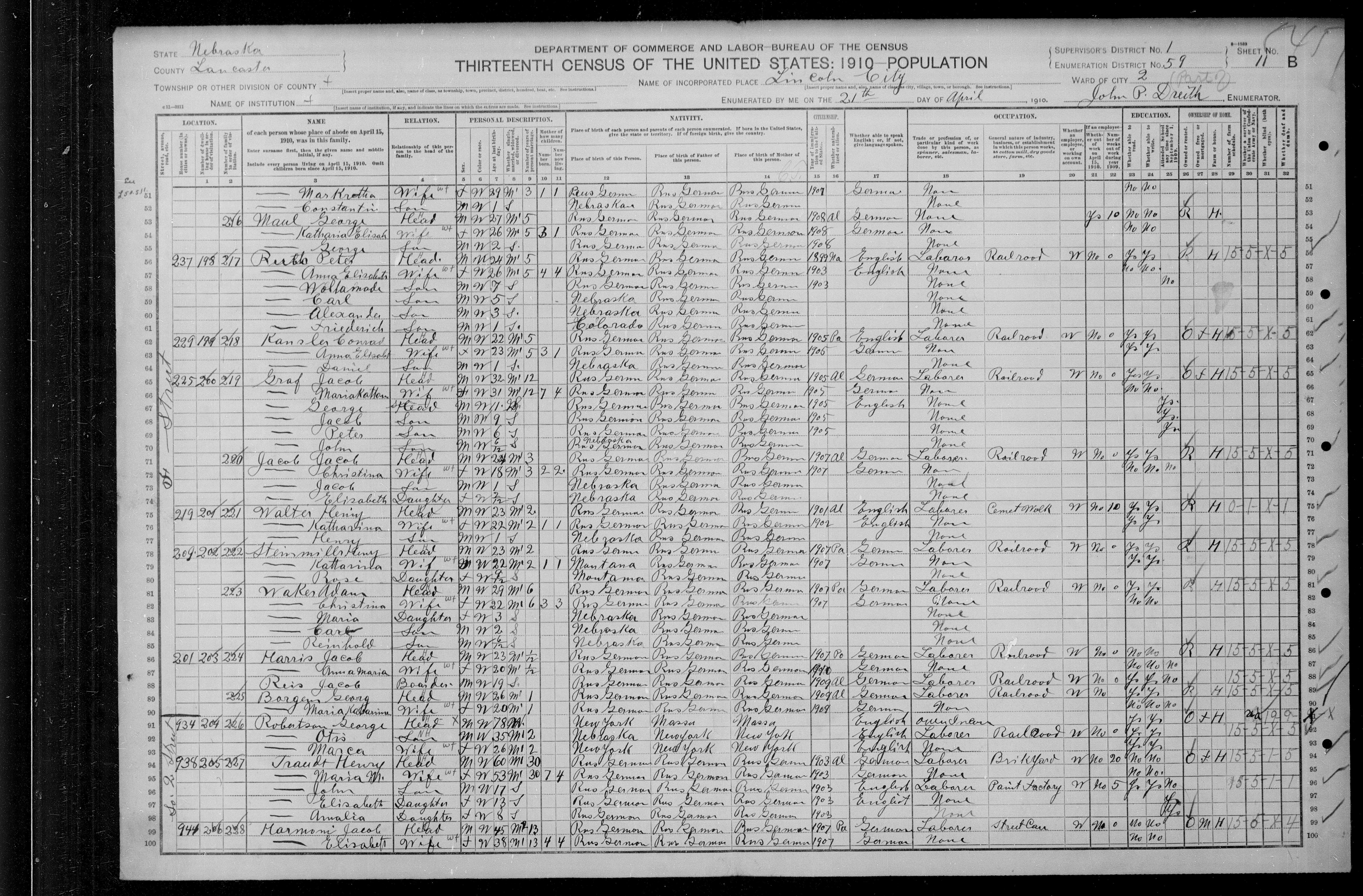 6417. “United States Census,” 1910, NE, Lancaster, Lincoln, Ward 4, 11B-12A, 1, 59, T624, 849, 256, Bureau of the Census, US Dept. of Commerce, United States of America, April 22, 1910, John P Dreith.
