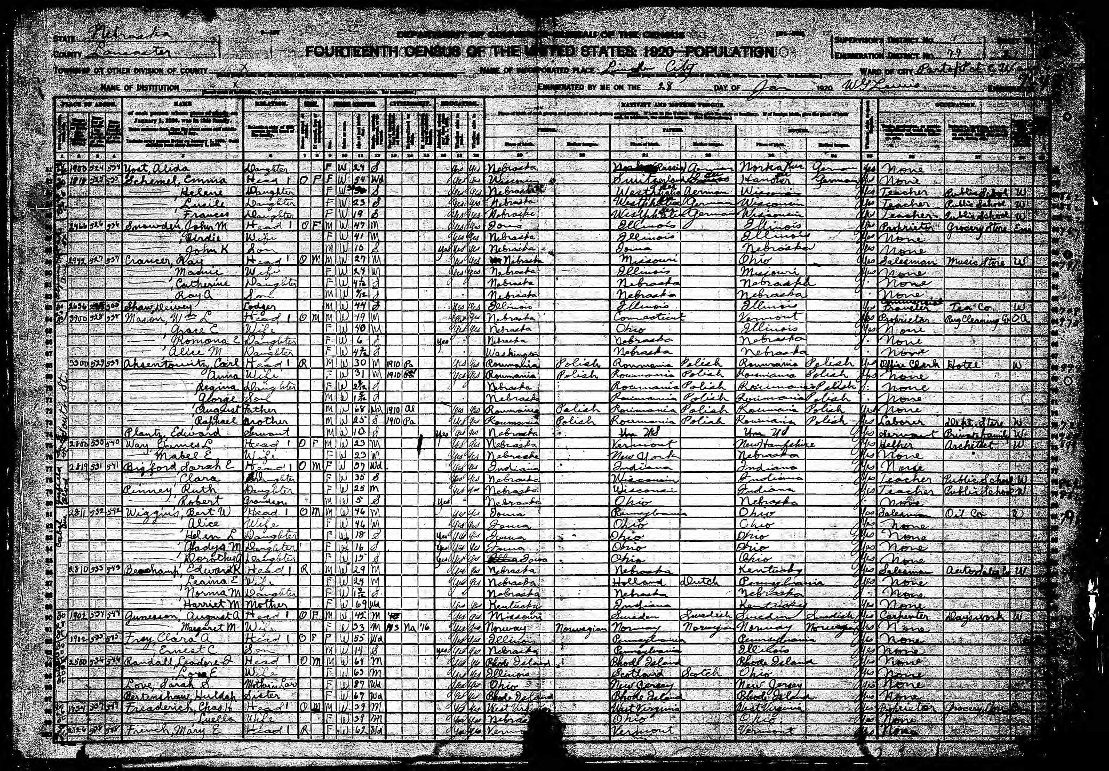 6408. “United States Census,” 1920, NE, Lancaster, Lincoln, Ward 6, Precinct C, 21B, 1, 77, T625, 996, 1010, Bureau of the Census, US Dept. of Commerce, United States of America, January 28, 1920, W G Lewis.