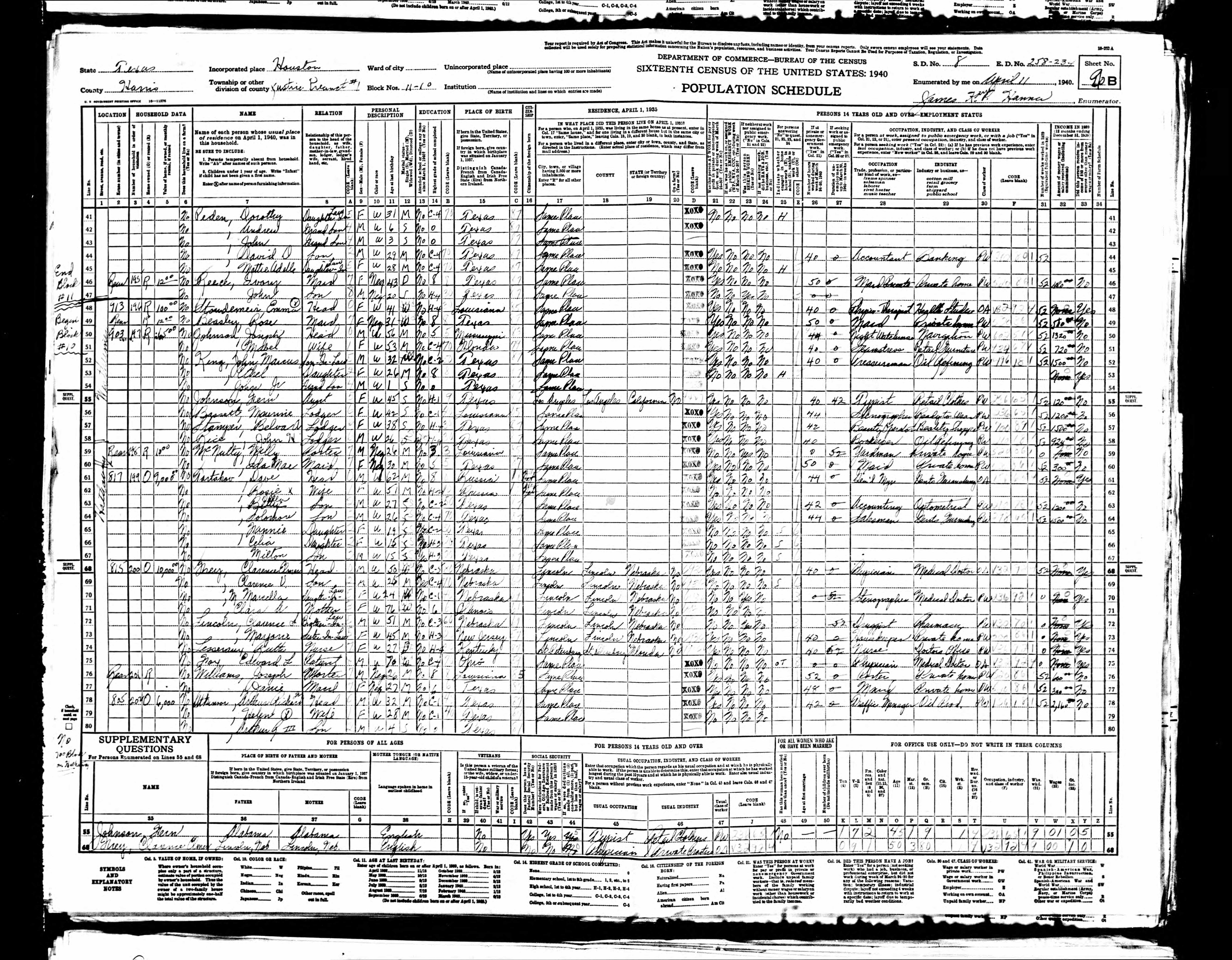 6410. “United States Census,” 1940, TX, Harris , Houston, Precinct 1, 9B, 8, 258-234, T627, 4197, Bureau of the Census, US Dept. of Commerce, United States of America, April 11, 1940, James Hanna.