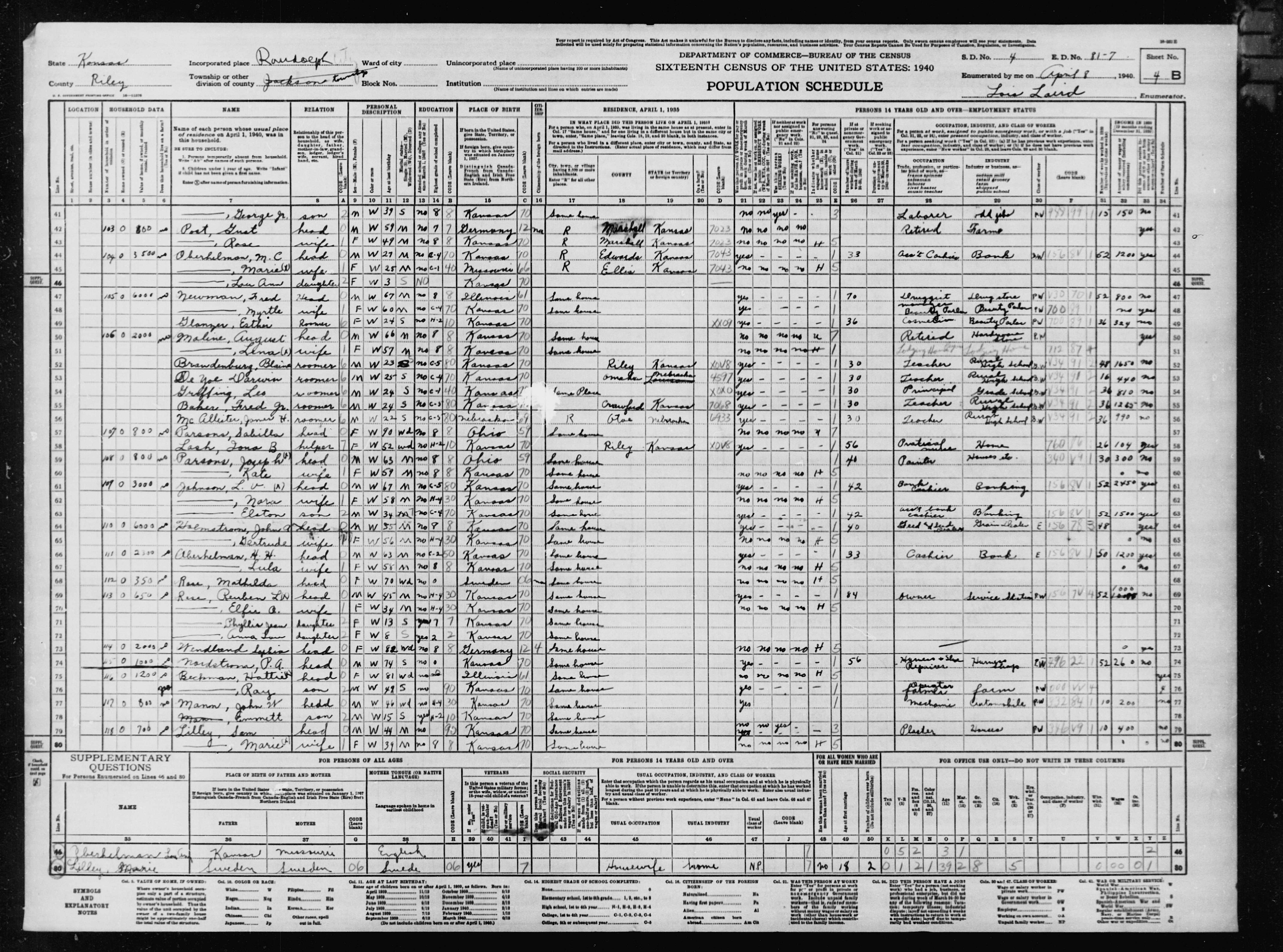 6409. “United States Census,” 1930, NE, Lancaster, Lincoln, Ward 9, 21A, 8, 55-41, T626, 1286, 318, Bureau of the Census, US Dept. of Commerce, United States of America, April16, 1930, Ruby L Gilmore.