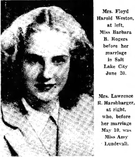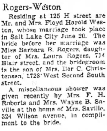 6456. Floyd Harold Weston and Barbara R Rogers, The Salt Lake Tribune, Salt Lake City, UT, June 28, 1942, 25.