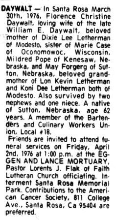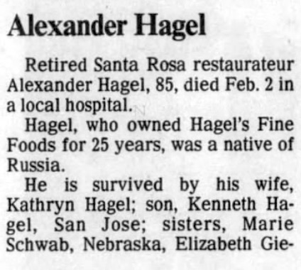 6482. “Funeral Notices and Obituaries,” Alexander Hagel, The Press Democrat, Santa Rosa, CA, February 6, 1989, 4.