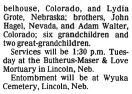 Services will be 1:30 p.m. Tuesday at the Butherus-Maser & Love Mortuary in Lincoln, Neb.