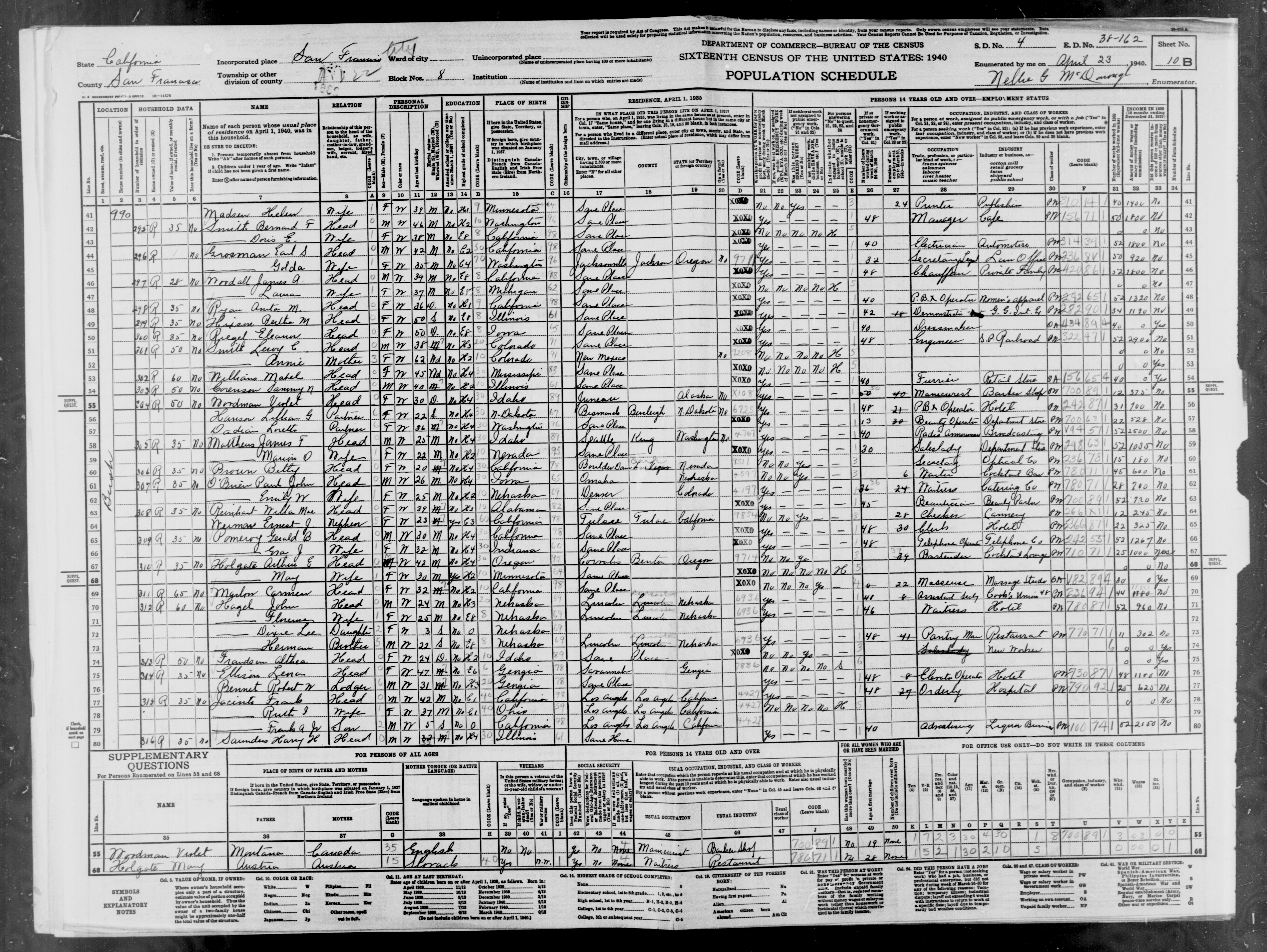 6484. “United States Census: 1940,” Bureau of the Census, US Dept. of Commerce, United States of America, 1940, CA, San Francisco, San Francisco, Assembly District 22, April 20, 1940, Richard Glassman, 6A, 4, 38-152, T627, 304, 84.