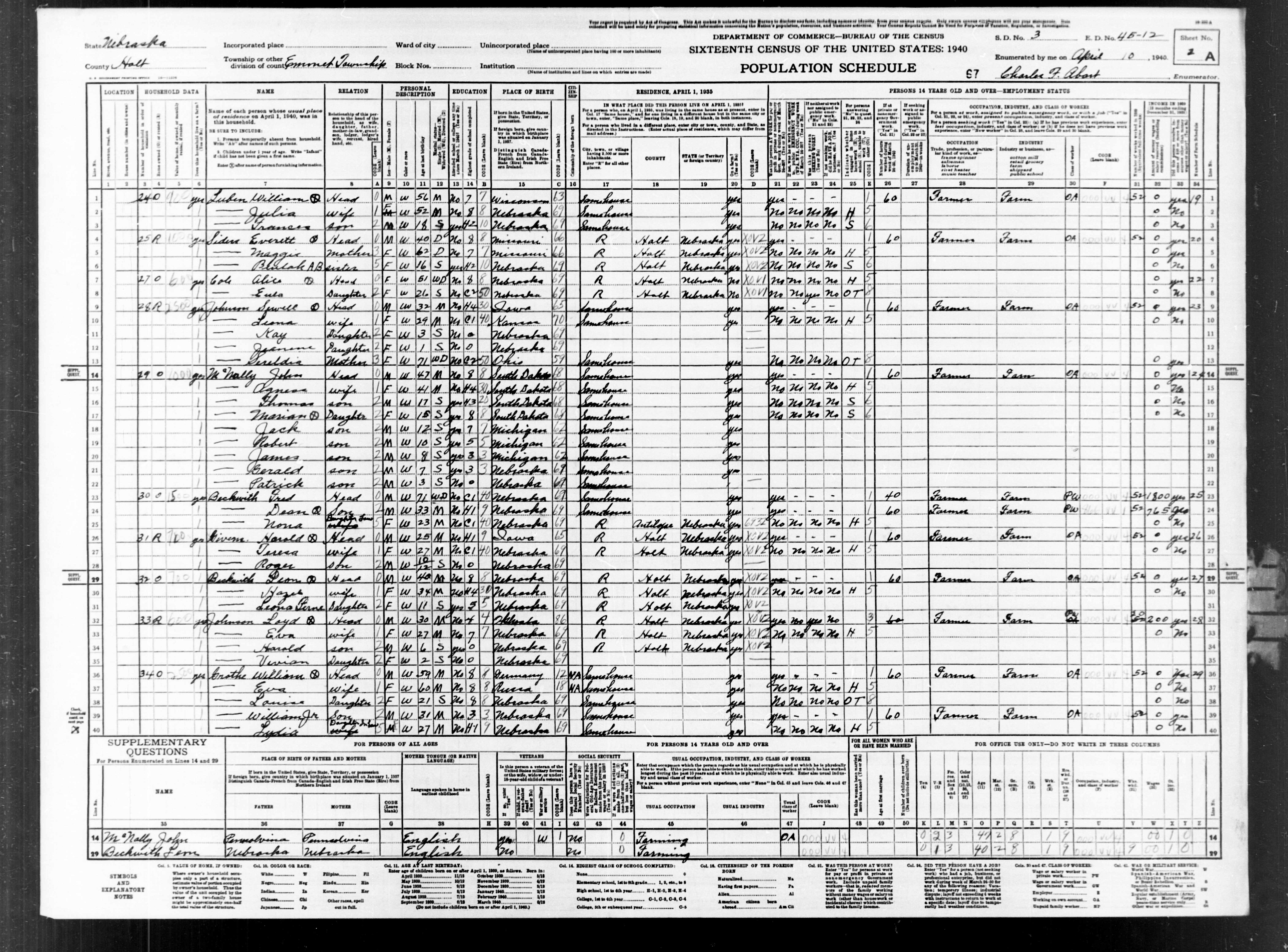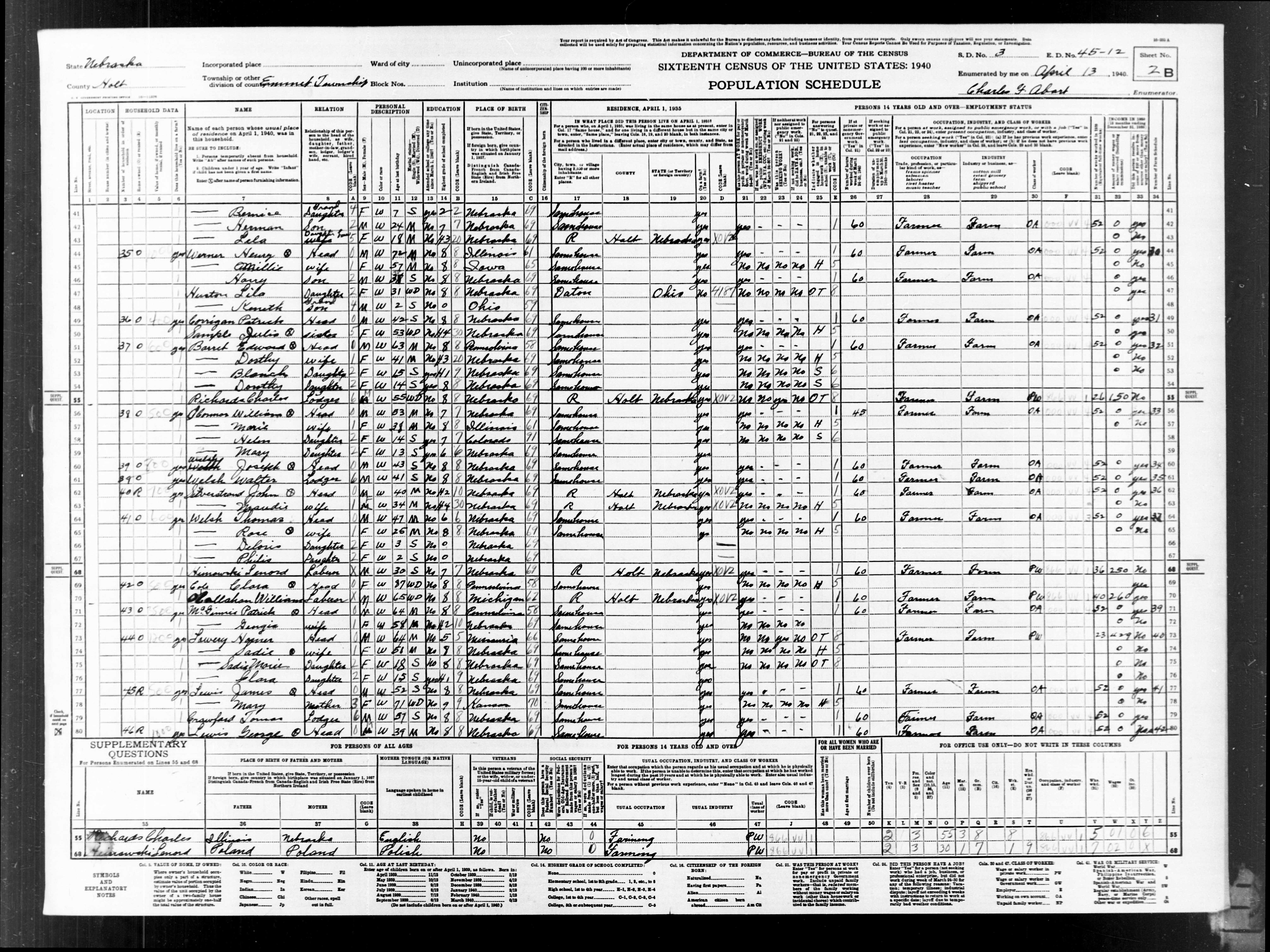 6508. “United States Census: 1940,” Bureau of the Census, US Dept. of Commerce, United States of America, 1940, NE, Holt, Emmet, April 13, 1940, Charles F Abort, 2A, 3, 45-12, T627, 2250, 146.