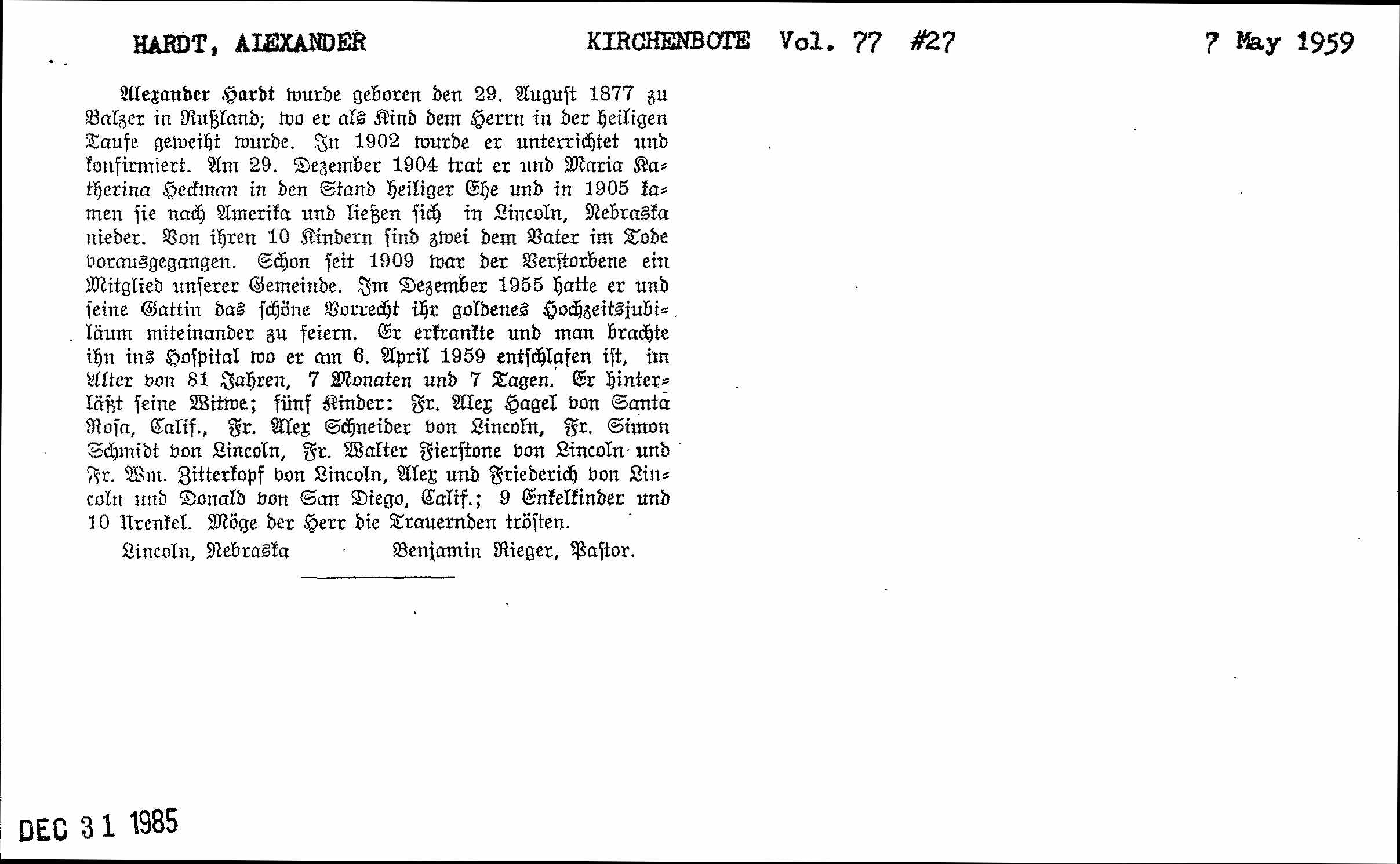 Alexander Hardt wurde geboren den 29, August 1877 zu Balzer in Rußland; mo er als kind dem herrn in der heiligen Taufe gemeiht wurde. In 1902 wurde er unterrichtet und confirmiert. Um 29, Dezember 1904 trat er und Maria Katherina Hechman in den Stand heiliger Ehe und in 1905 kamen sie nach Amerika und ließen sich in Lincoln, Nebraska nieder. Von ihren 10 kindern sind zwei dem Pater in Tode vorausgegangen. Schon seit 1909 mar der Verstorbene ein Mitglied unserer Gemeinde. Im Dezember 1955 hatte er und seine Gattin das schöne Vorrecht ihr goldenes Hochzeitsjubiläum miteinander zu seiern. Er erkrankte und man brachte ihn ins hospital mo er am 6, April 1959 enischlafen ist, im Alter von 81 Jahren, 7 Monaten und 7 Tagen. Er hinterläßt seine Witme; fünf kinder: Fr. Alex Hagel von Santa Rosa, Calif., Fr. Alex Schneider von Lincoln, Fr. Simon Schmidt von Lincoln, Fr. Walter Fierstone von Lincoln und Fr. Wm. Bitterkopf von Lincoln, Alex und Friederich von Lincoln and Donald von San Diego, Calif.; 9 Enkelkinder und 10 Urenkel. Möge der herr die Trauernden trösten.