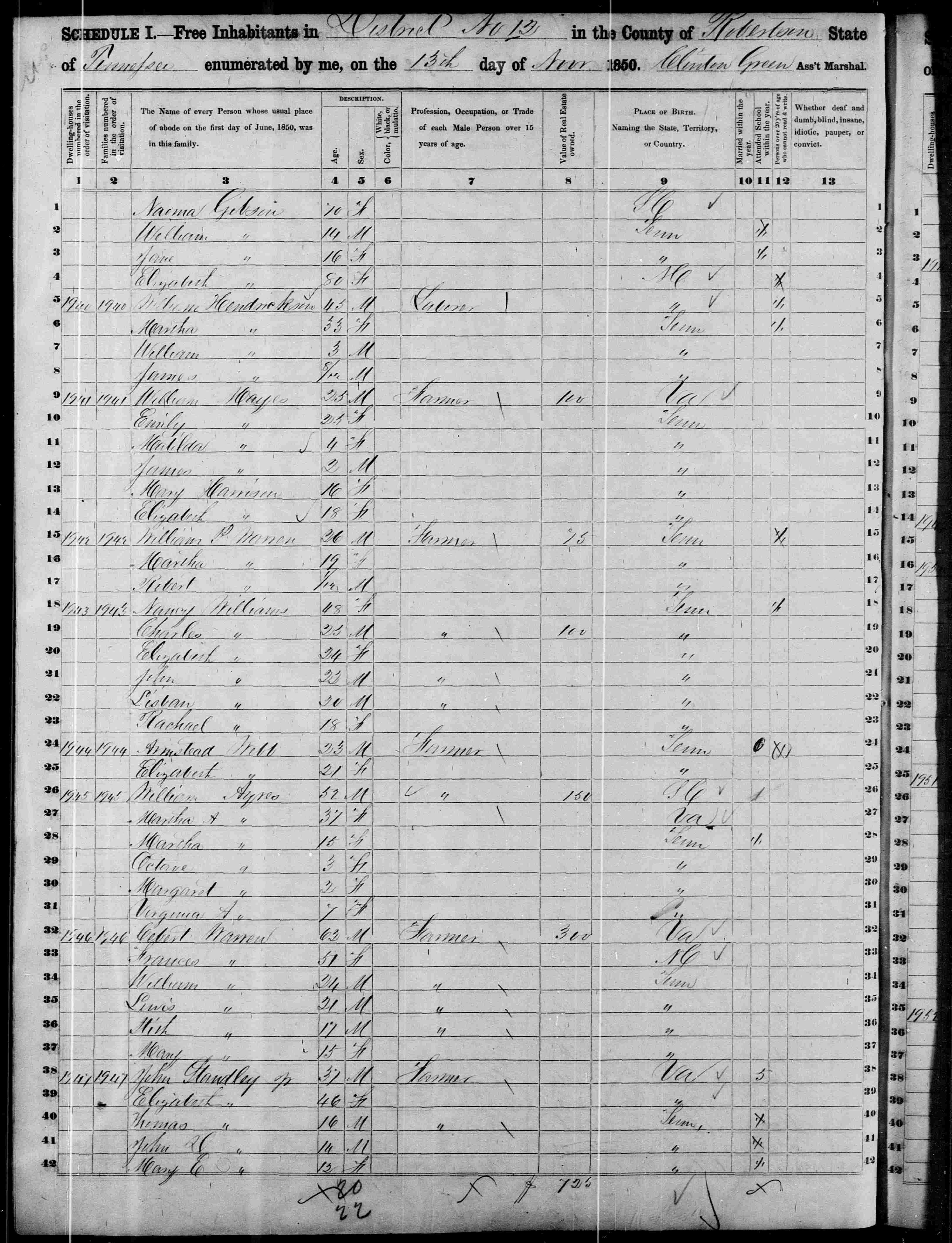 6532. “United States Census: 1850,” Bureau of the Census, US Dept. of Commerce, United States of America, 1850, TN, Robertson, District 12, November 13, 1850, Clinton Green, 108, 208.