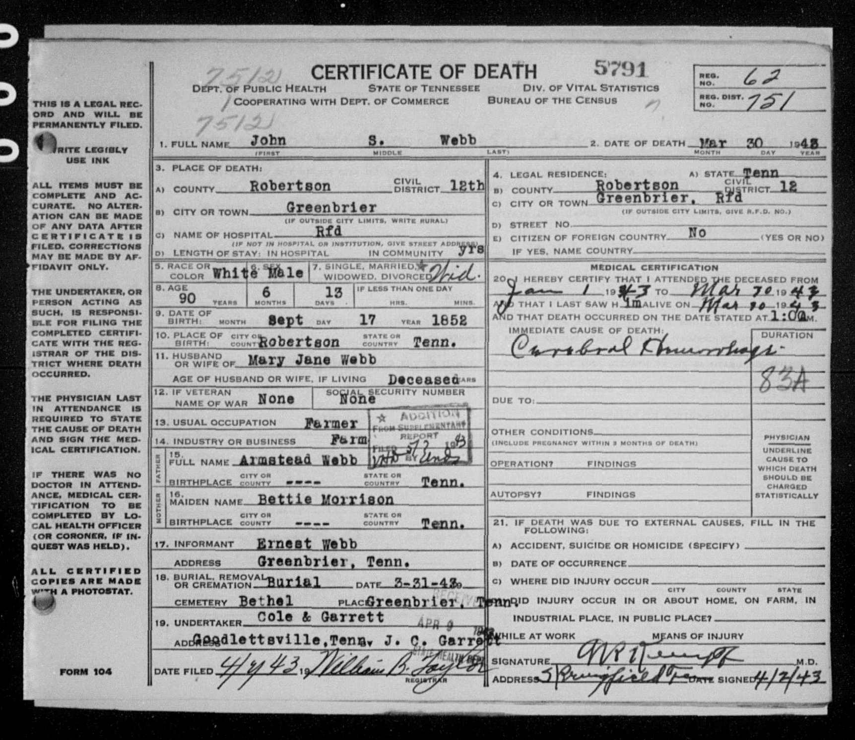 6536. John S Webb, “Tennessee Death Records, 1914-1955,” microfilm, digital folder number: 4184875-image number: 879-film number: 2137333-volume/page/certificate number: cn 5791, https://familysearch.org/pal:/MM9.1.1/NSXQ-P3Y.