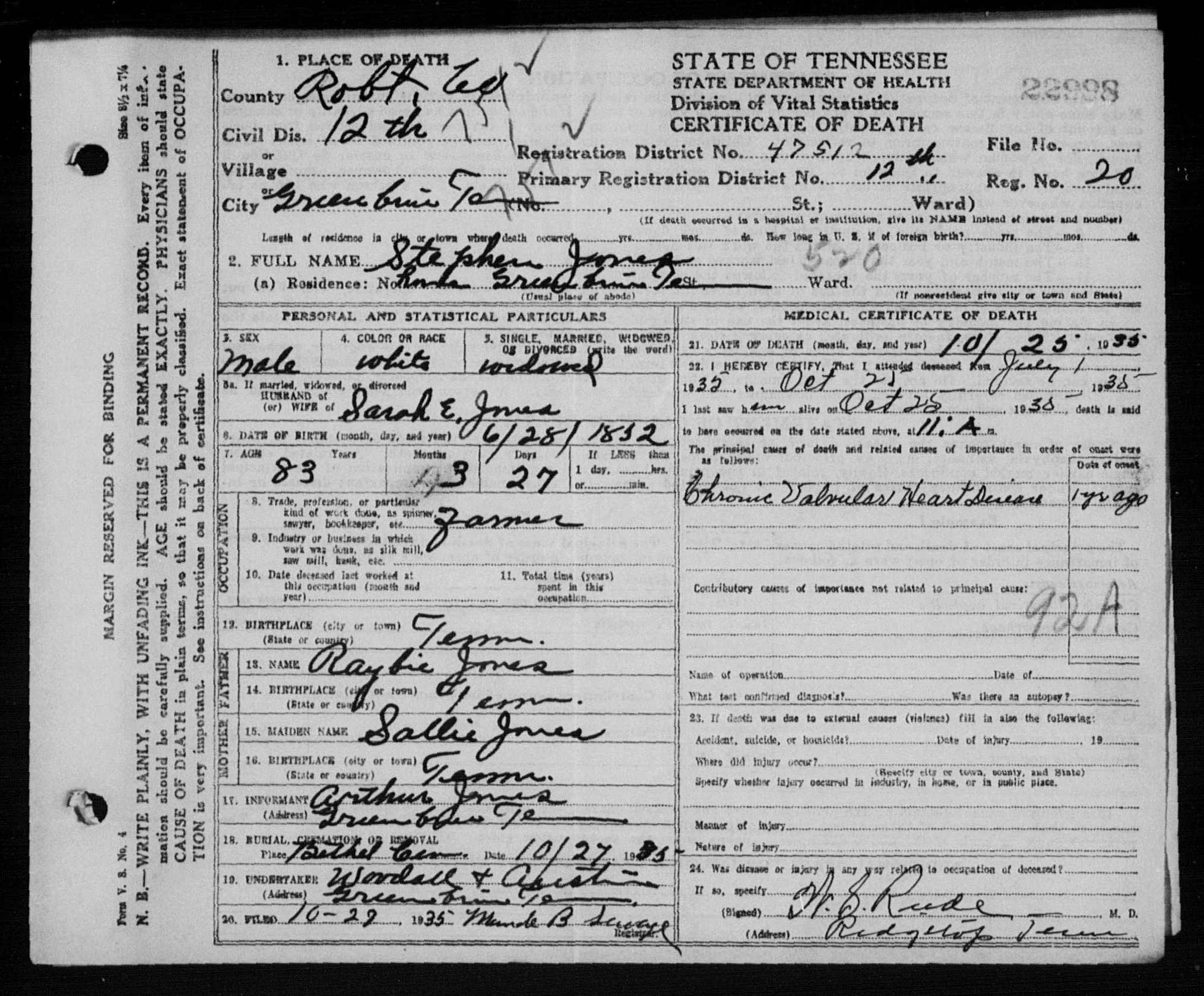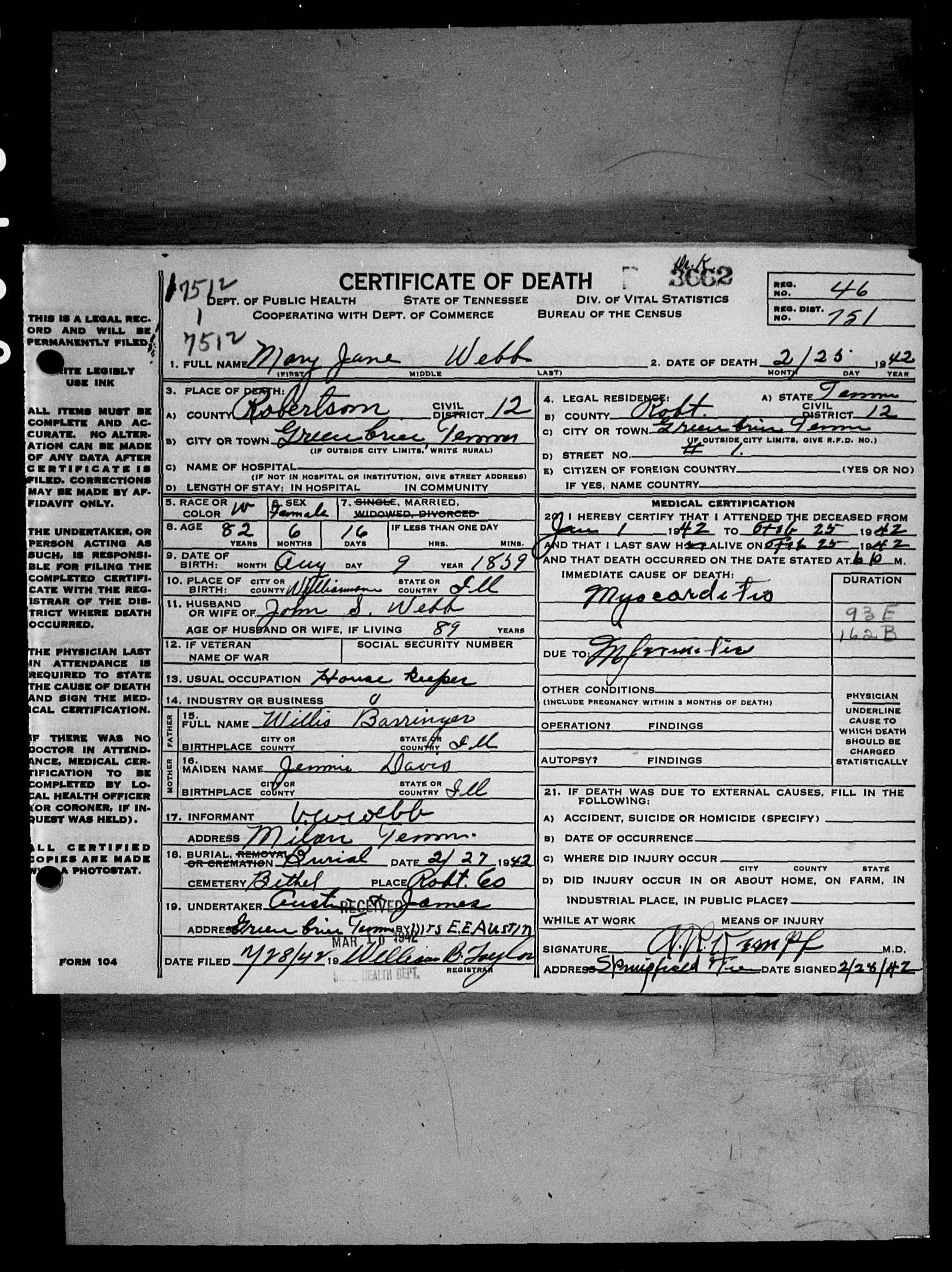6537. Mary Jane Webb, “Tennessee Death Records, 1914-1955,” microfilm, digital folder number: 4184473-image number: 1354-film number: 1876908-volume/page/certificate number: cn 3662, https://familysearch.org/pal:/MM9.1.1/NSMT-54R.