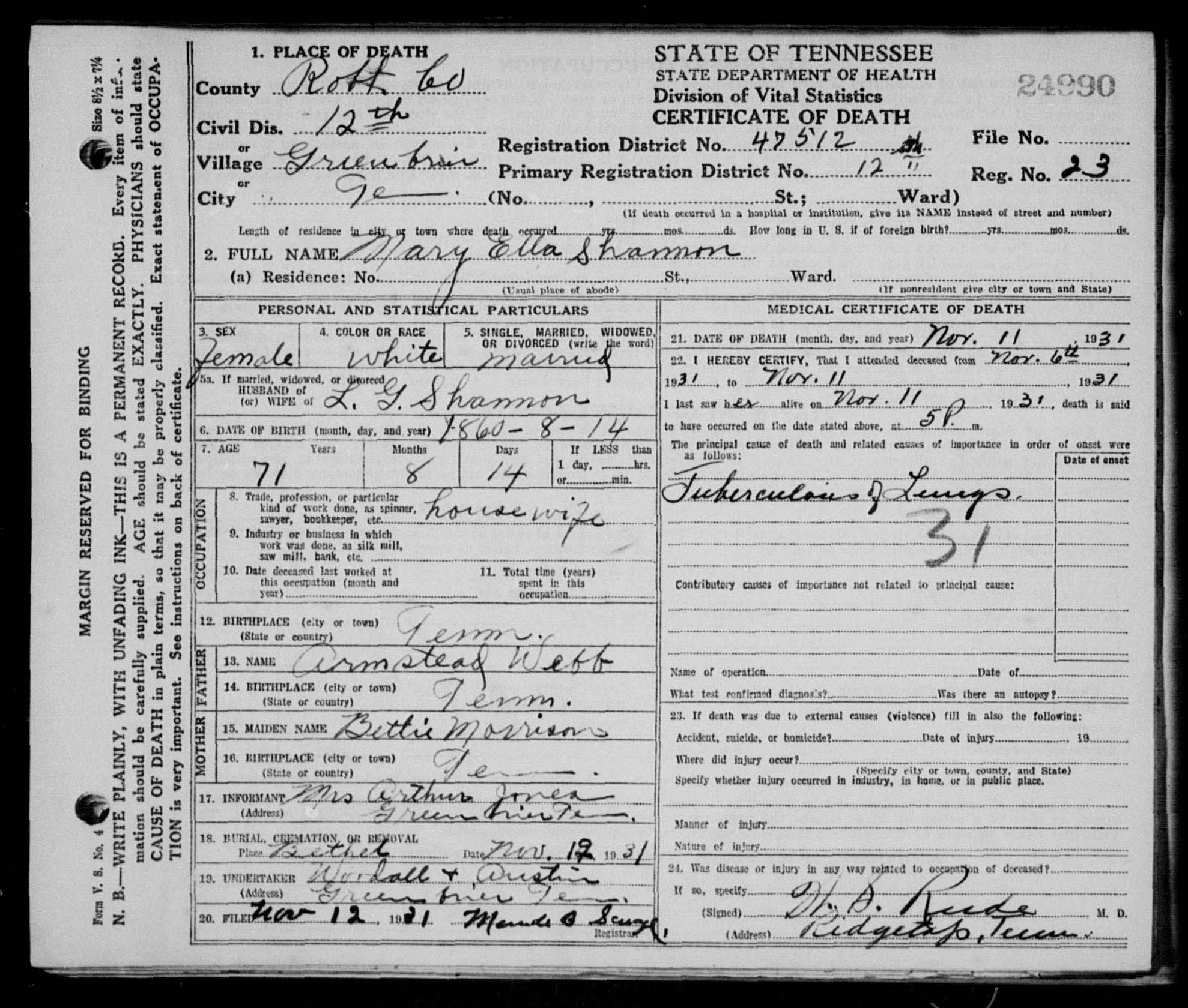 6538. Mary Ella Shannon, “Tennessee Death Records, 1914-1955,” microfilm, digital folder number: 4184125-image number: 2506-film number: 1876782-volume/page/certificate number: cn 24990, https://familysearch.org/pal:/MM9.1.1/N9LY-HMB.
