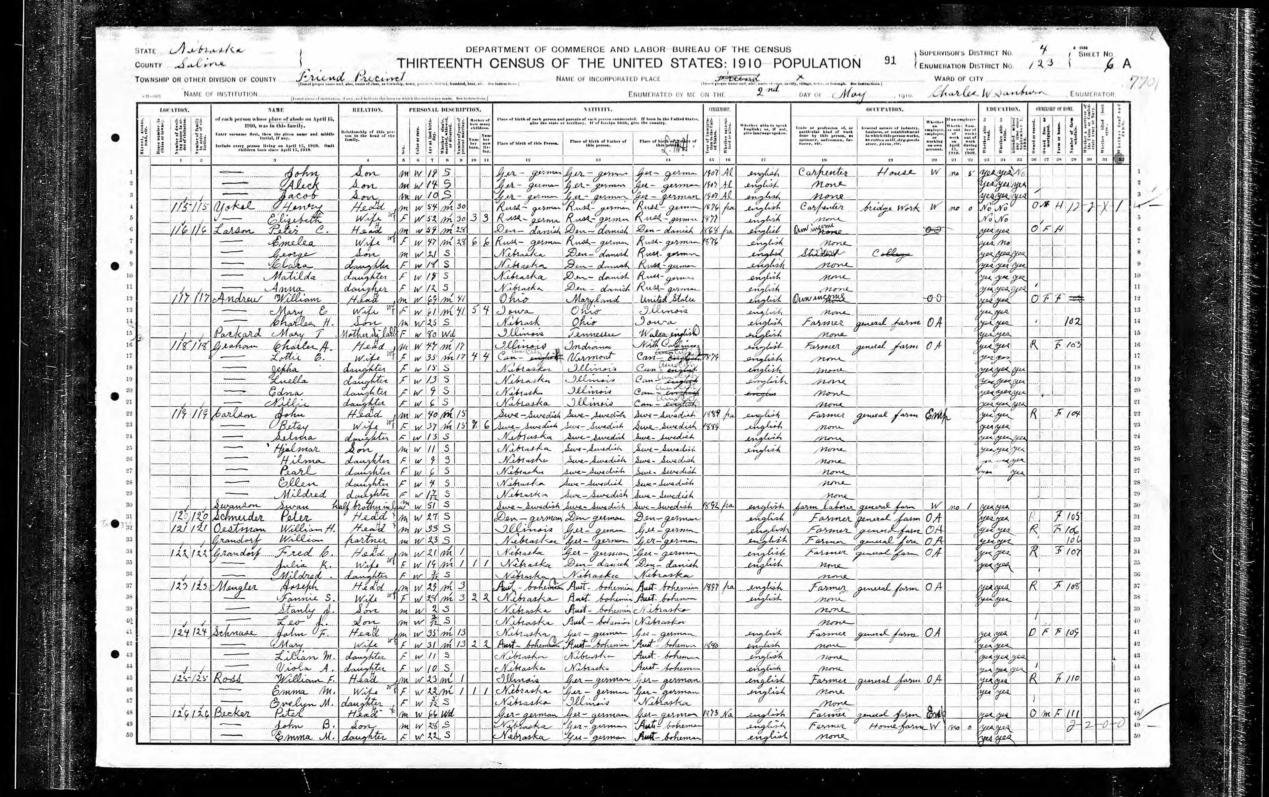 6552. “United States Census,” 1910, NE, Saline, Friend, 6A, 4, 123, T624, 854, Bureau of the Census, US Dept. of Commerce, United States of America, May 2, 1910, Charles W Sanburn.
