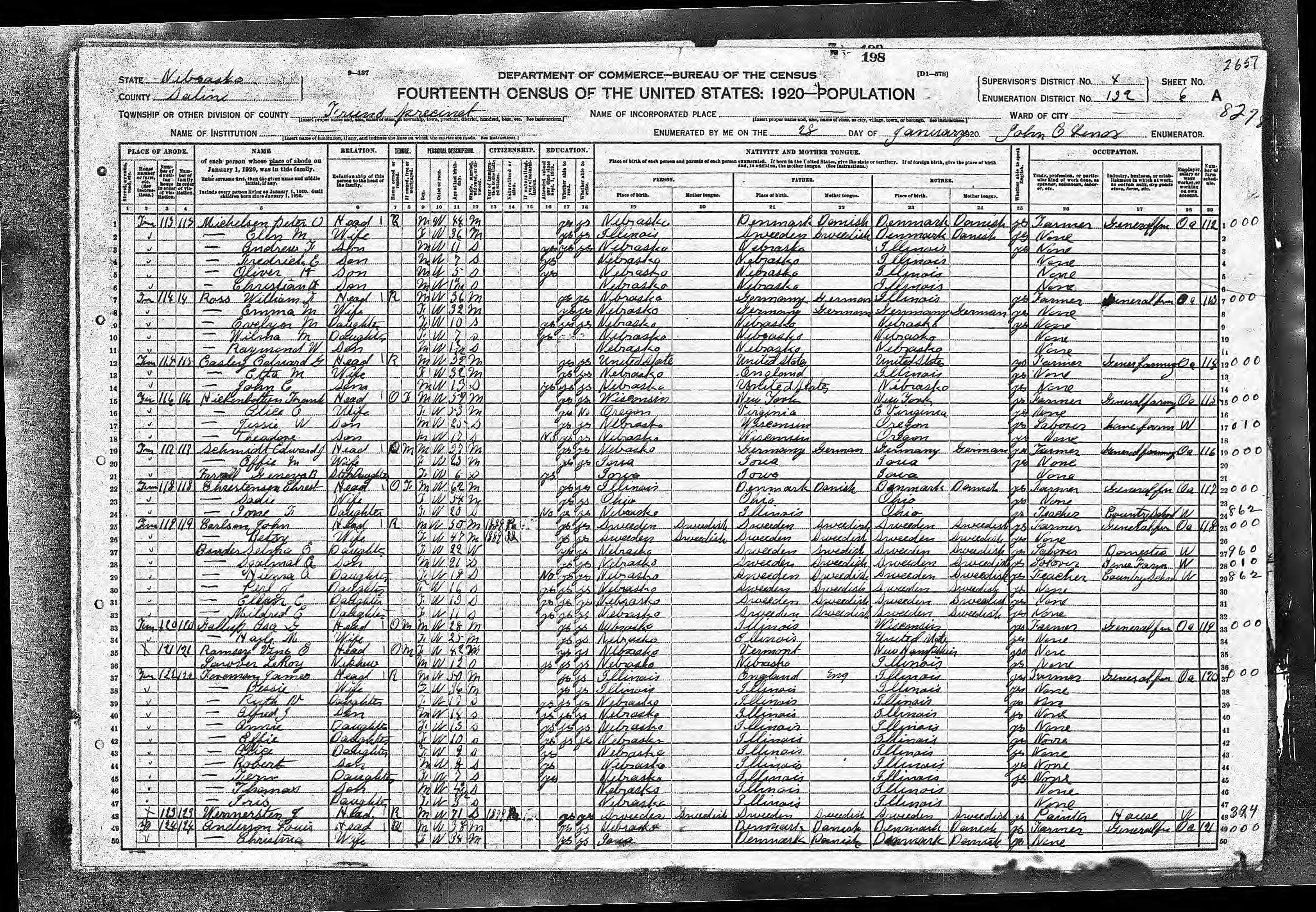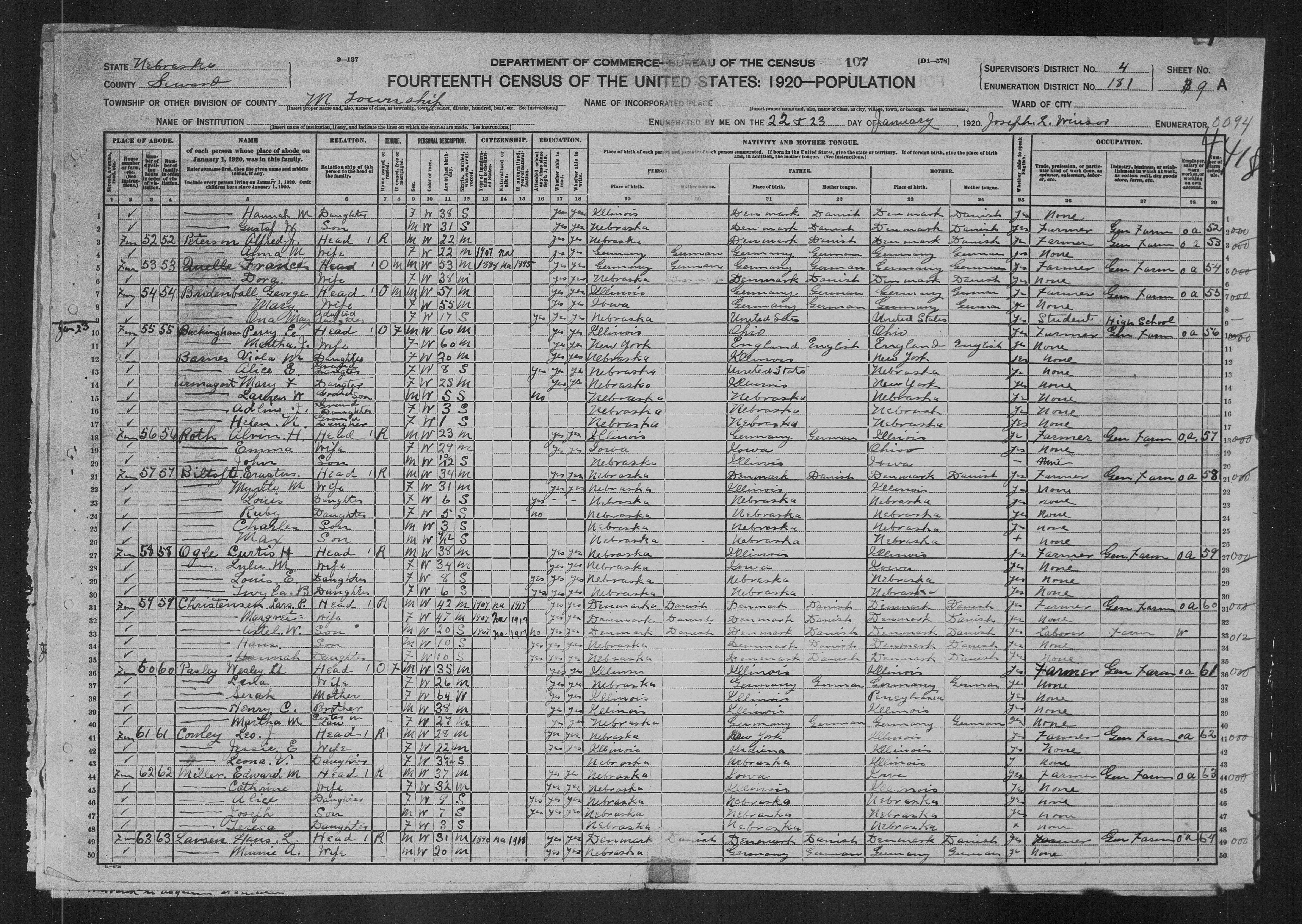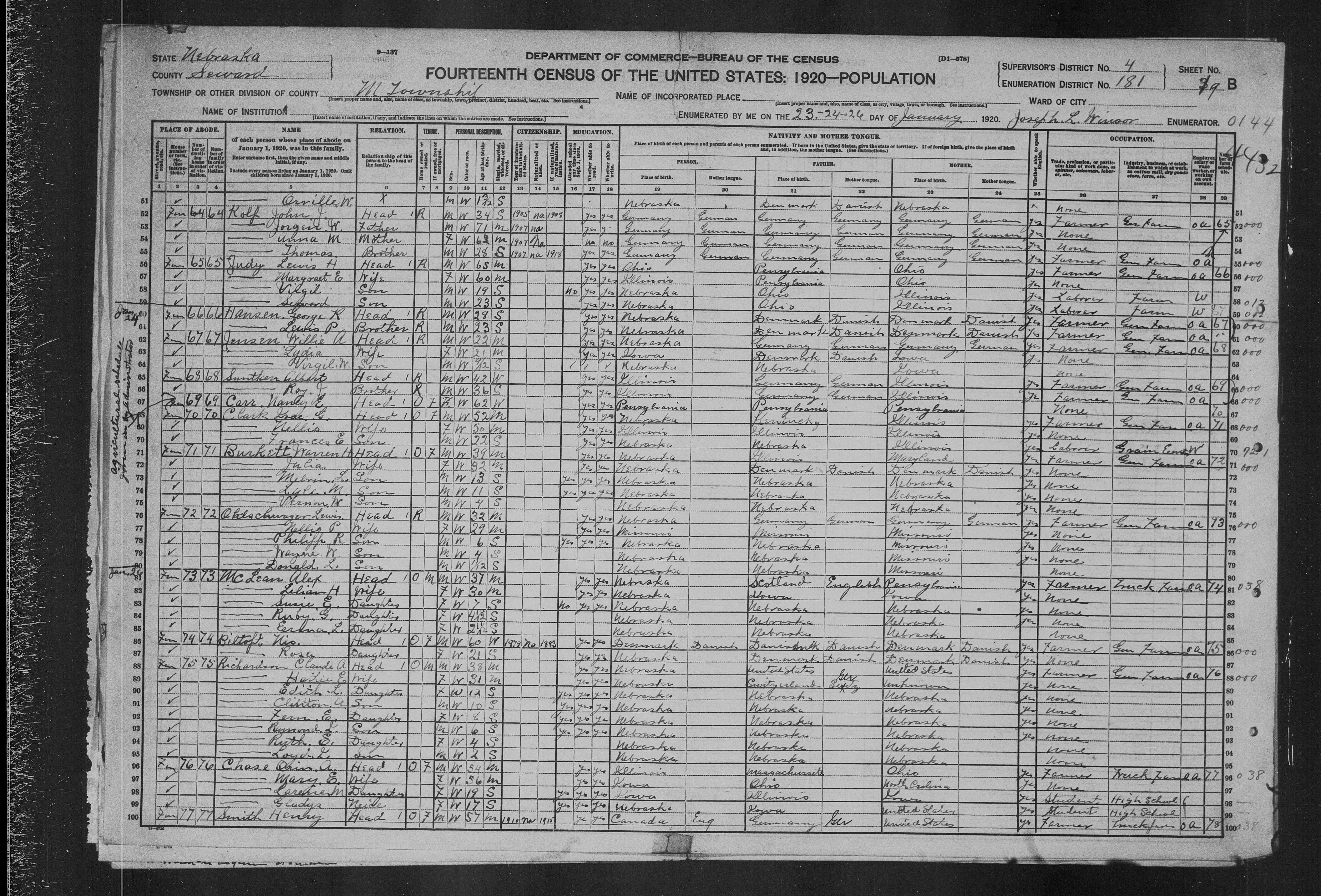 6579. “United States Census,” 1920, NE, Seward, Township M, 9A-9B, 4, 181, T625, 218, Bureau of the Census, US Dept. of Commerce, United States of America, January 23, 1920, Joseph L Winsor.