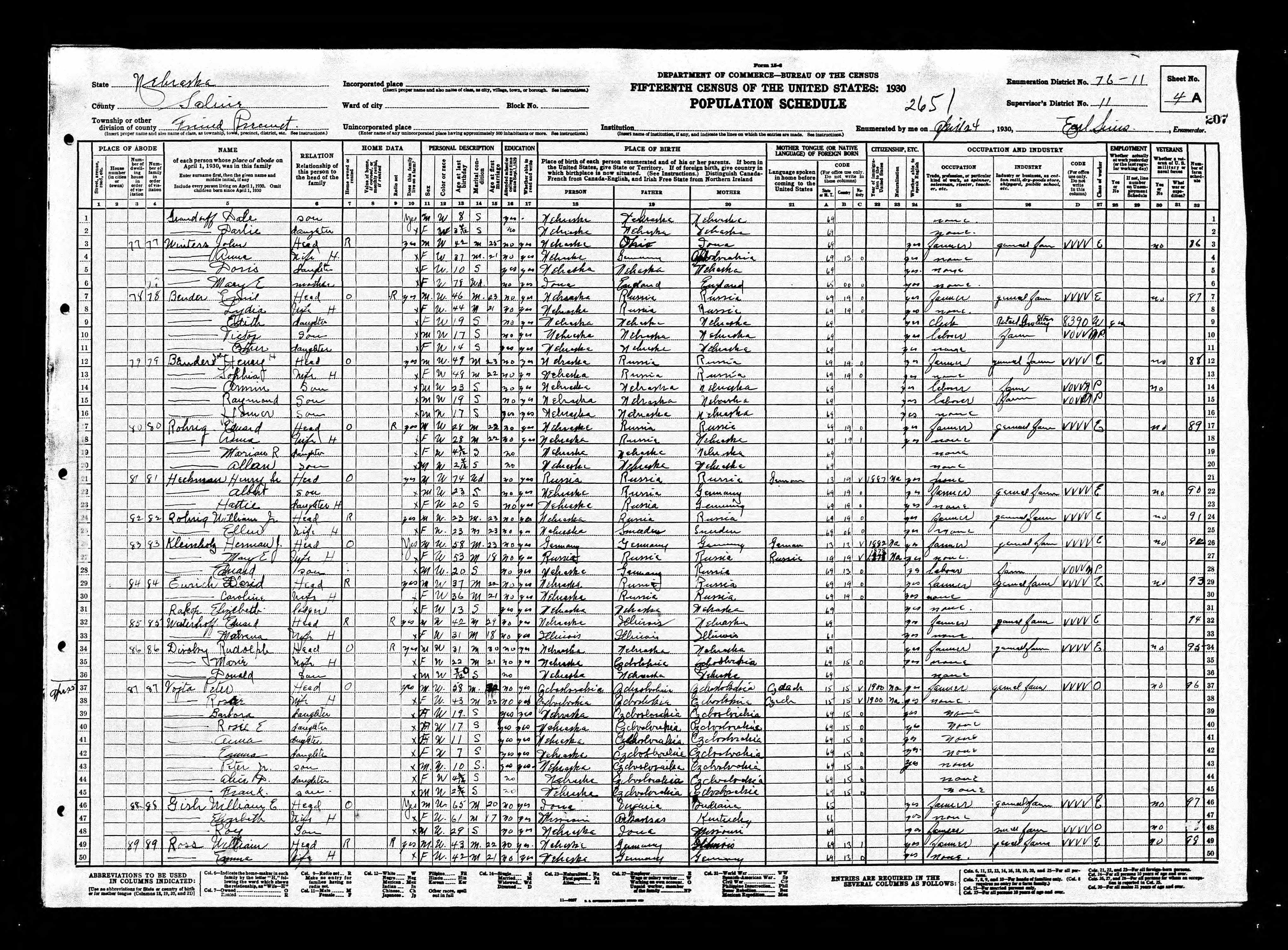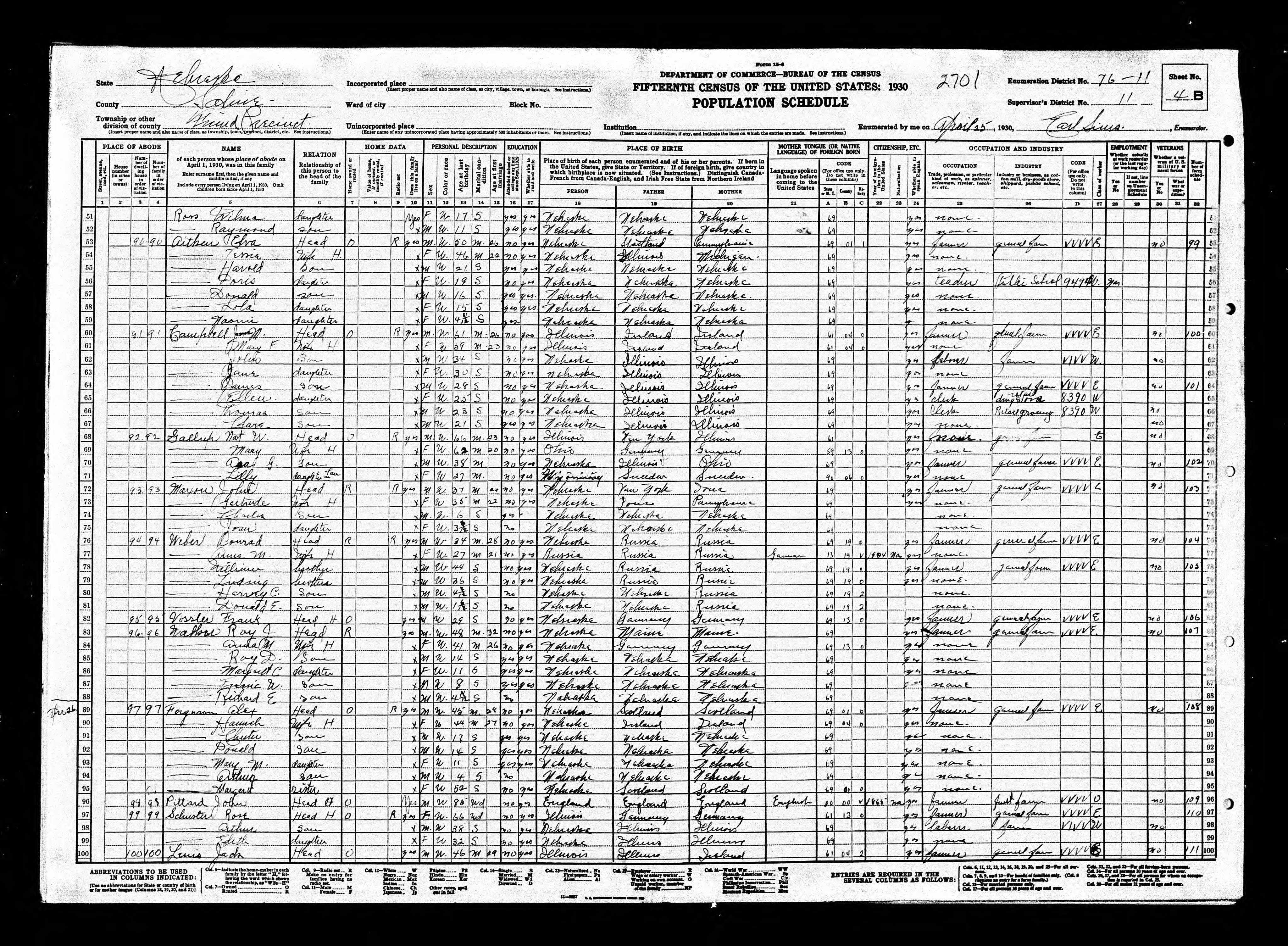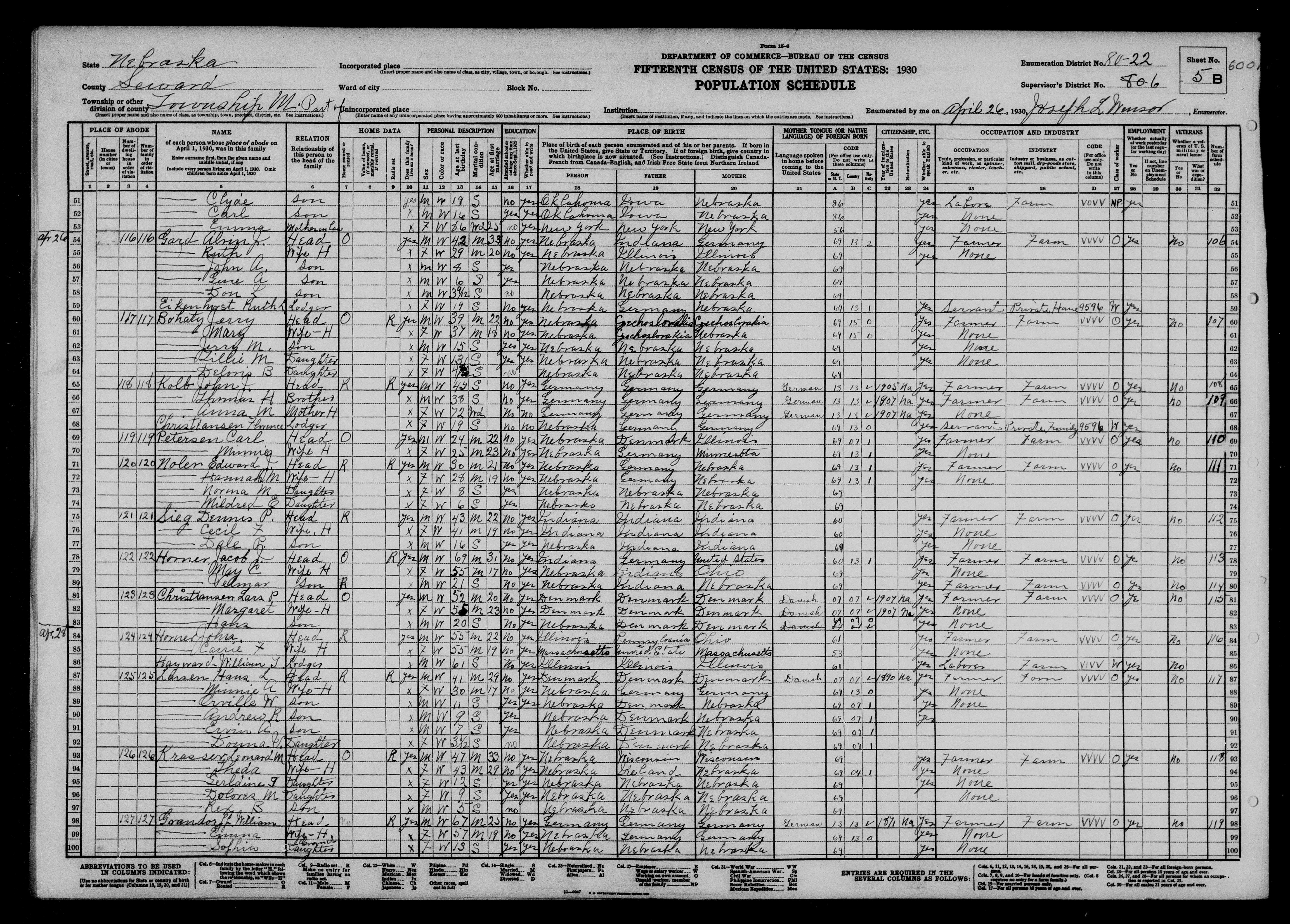 6580. “United States Census,” 1930, NE, Seward, Township M, 5B, 6, 80-22, T626, 1292, 463, Bureau of the Census, US Dept. of Commerce, United States of America, April 26, 1930, Joseph L Winsor.