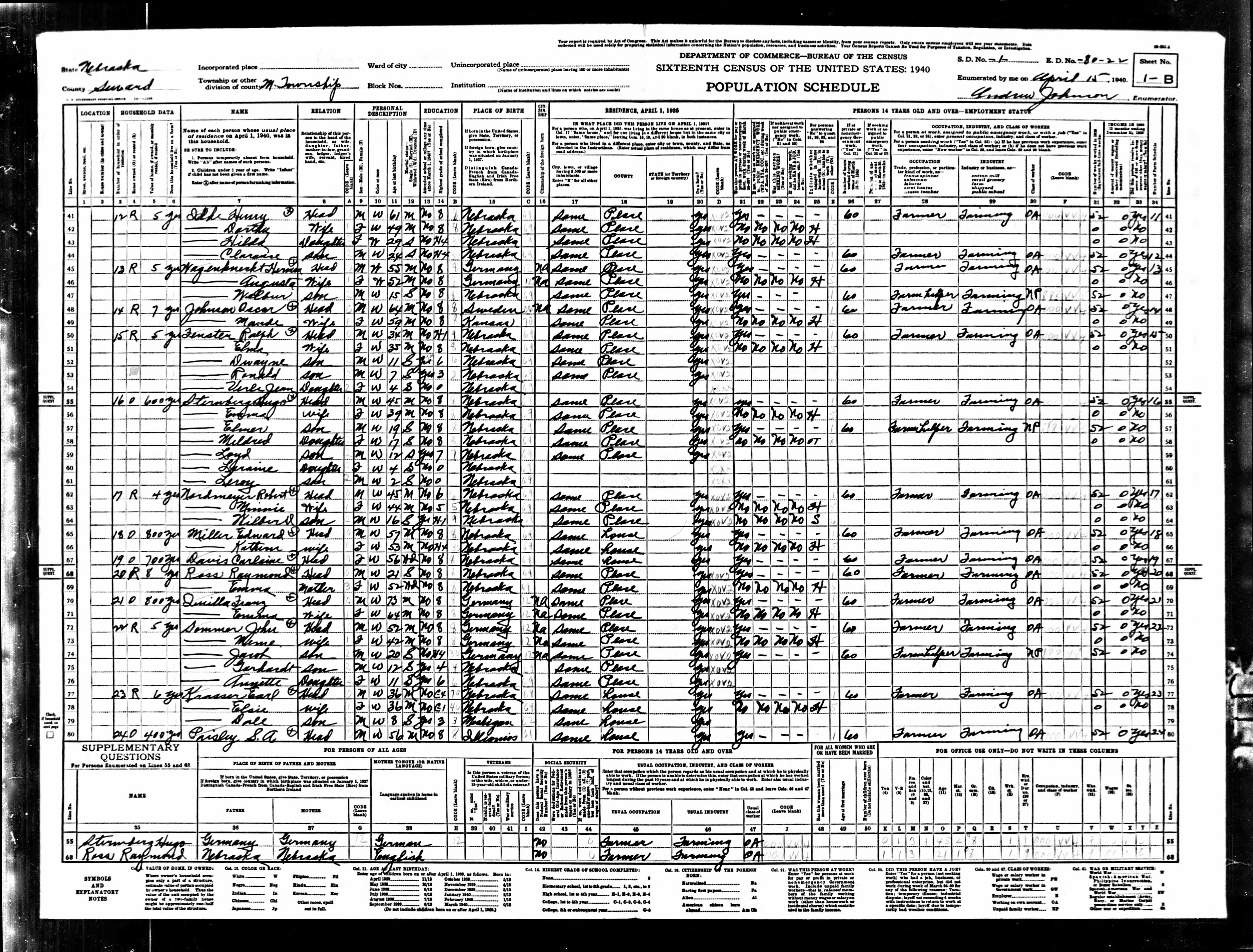 6555. “United States Census,” 1940, NE, Seward, M Township, 1B, 1, 80-22, T627, 2265, Bureau of the Census, US Dept. of Commerce, United States of America, April 15, 1940, Andrew Johnson.
