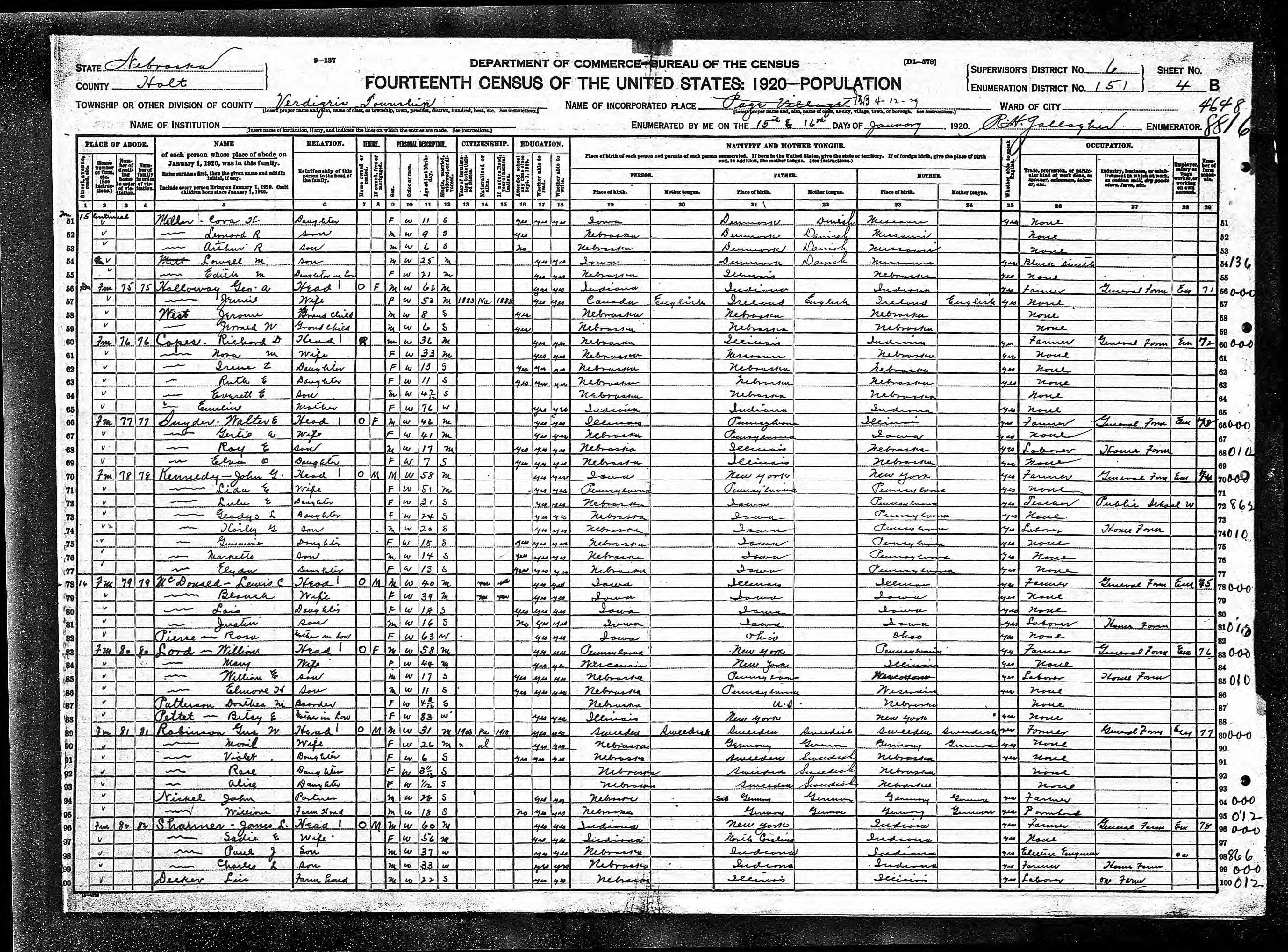 6563. “United States Census,” 1920, NE, Holt, Verdgigris, 4B, 6, 151, T625, 993, 833, Bureau of the Census, US Dept. of Commerce, United States of America, January 16, 1920, R H Gallagher.