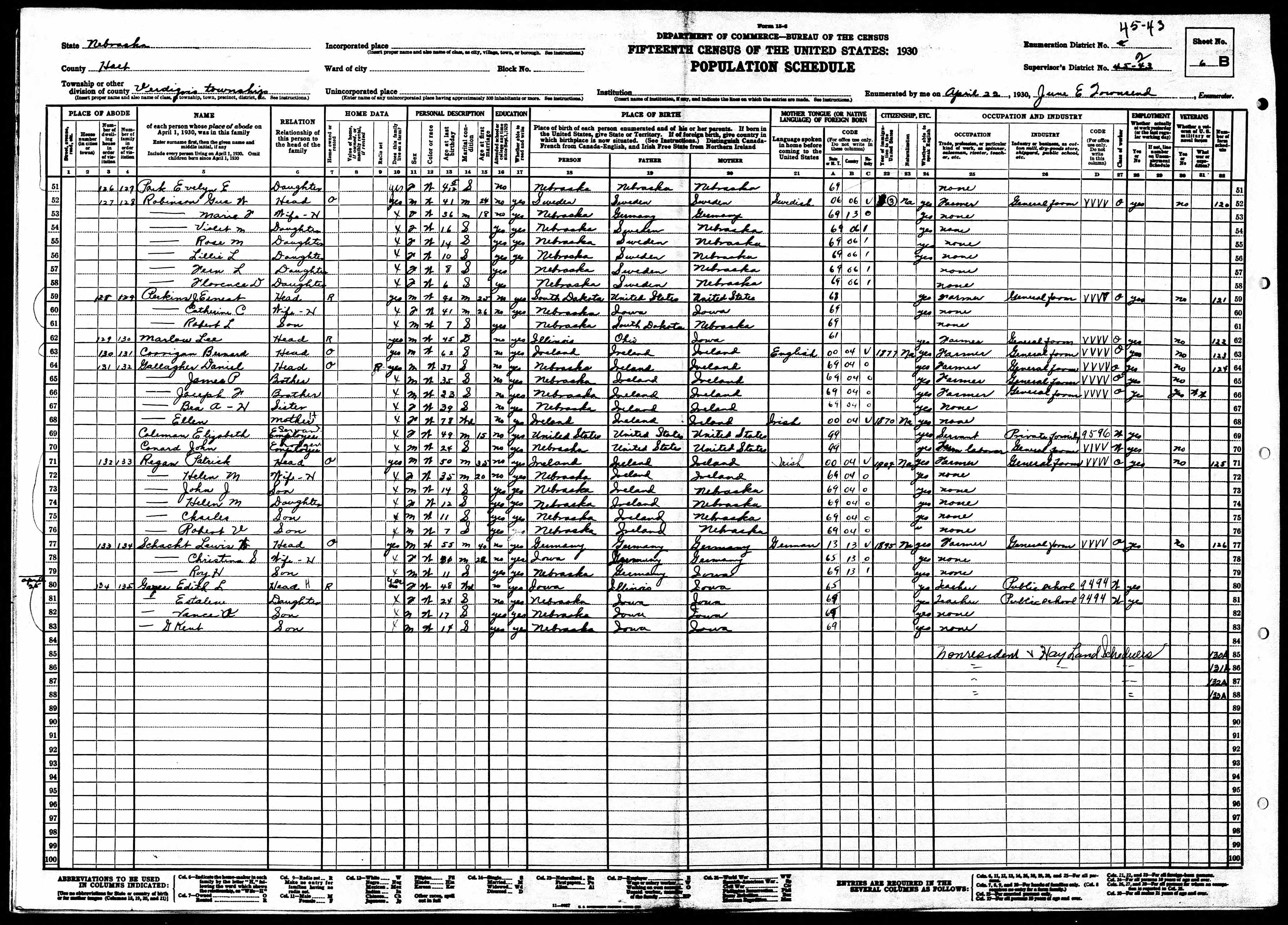 6569. “United States Census,” 1930, NE, Holt, Verdigris, 6B, 2, 43, T626, 1283, Bureau of the Census, US Dept. of Commerce, United States of America, April 22, 1930, June E Townsend.