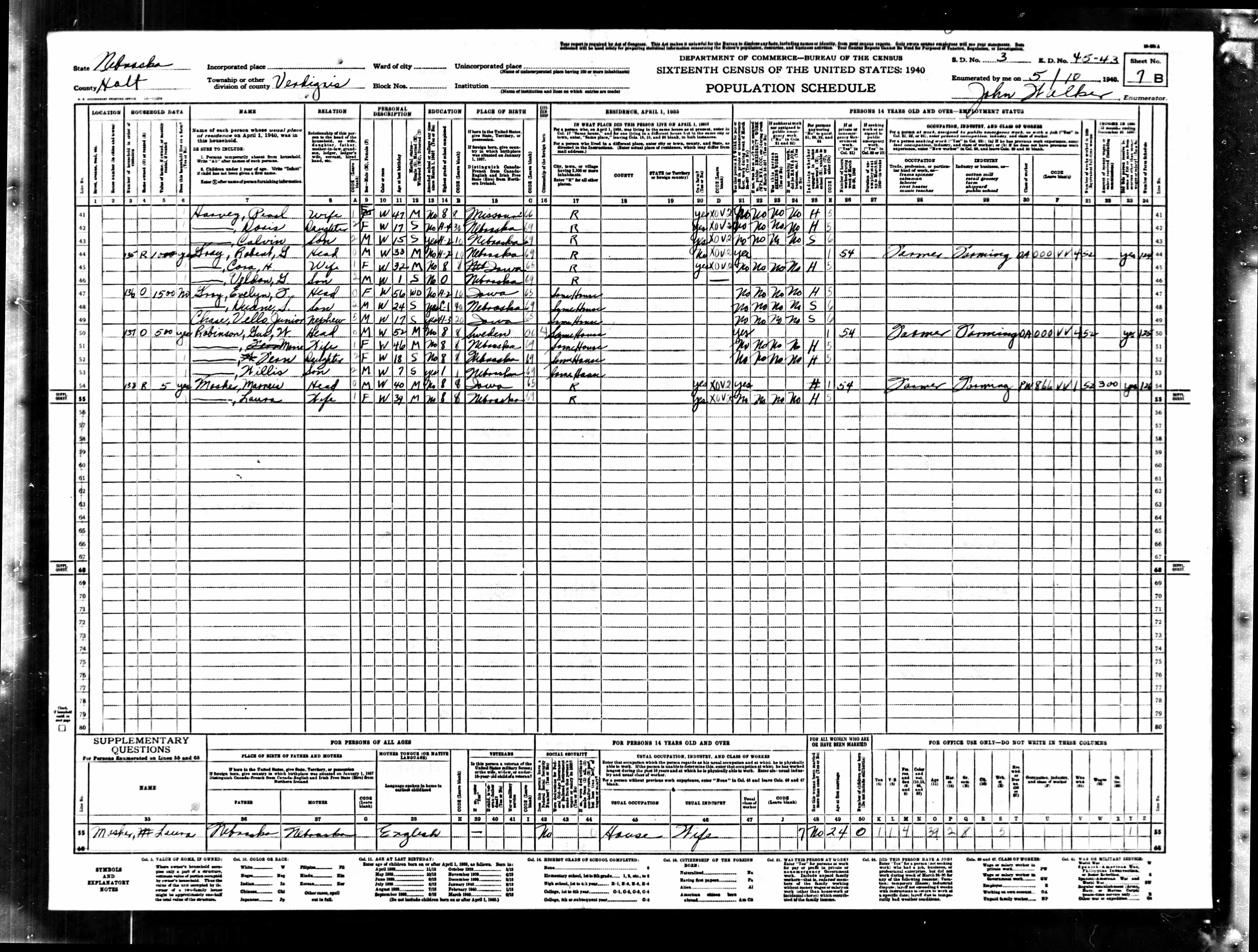 6570. “United States Census,” 1940, NE, Holt, Verdigris, 7B, 3, 45-43, T627, 2250, Bureau of the Census, US Dept. of Commerce, United States of America, May 10, 1940, John Walker.