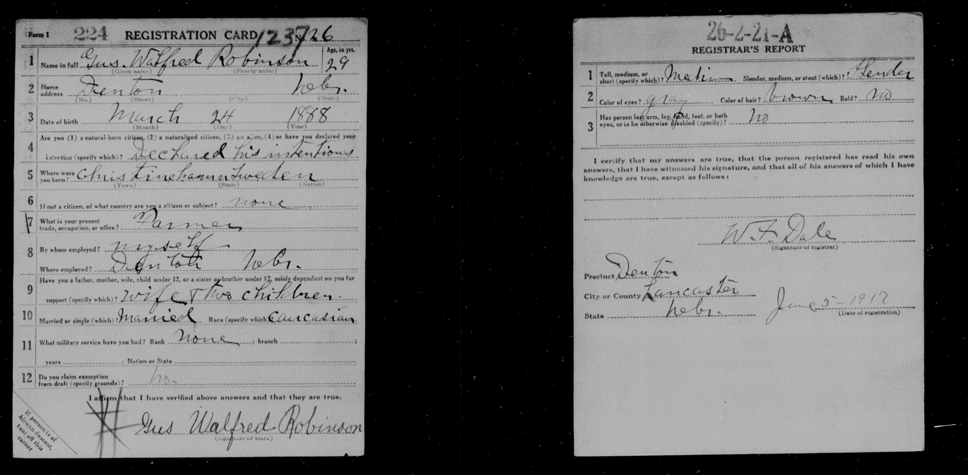 6572. World War I, 1917, Nebraska, 123726, Robinson, Gus Walfred, “World War I Selective Service System Draft Registration Cards,” June 5, 1917, Denton, Lancaster County, NE, USA, Affiliate Publication Number: M1509 , GS Film Number: 1711701 , Digital Folder Number: 005253441 , Image Number: 04317, https://familysearch.org/ark:/61903/1:1:29JN-NJ1.