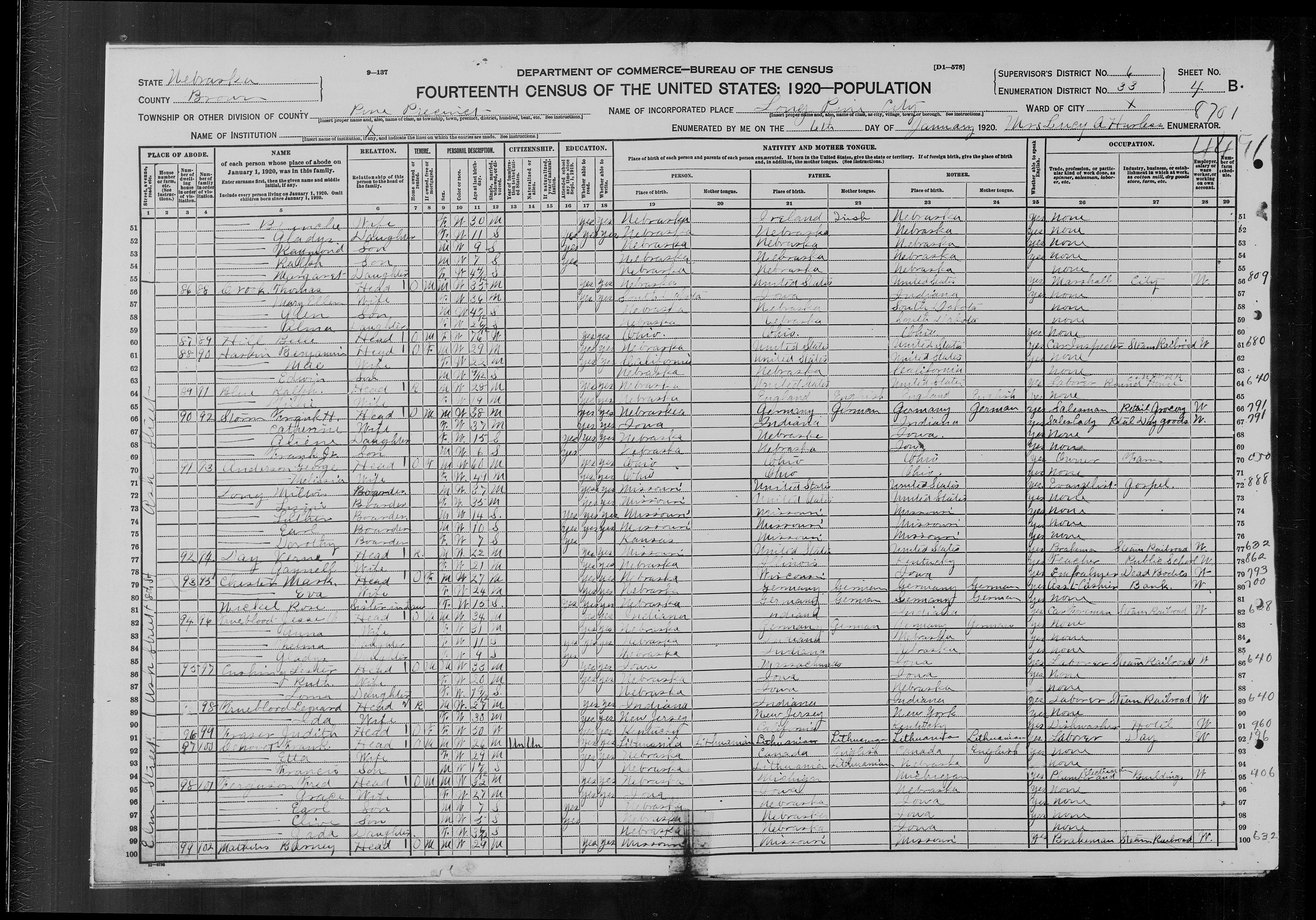 6575. “United States Census,” 1920, NE, Brown, Long Pine, Pine Precinct, 4B, 6, 33, T625, 138, Bureau of the Census, US Dept. of Commerce, United States of America, January 6, 1920, Mrs. Lucy A Hurless.