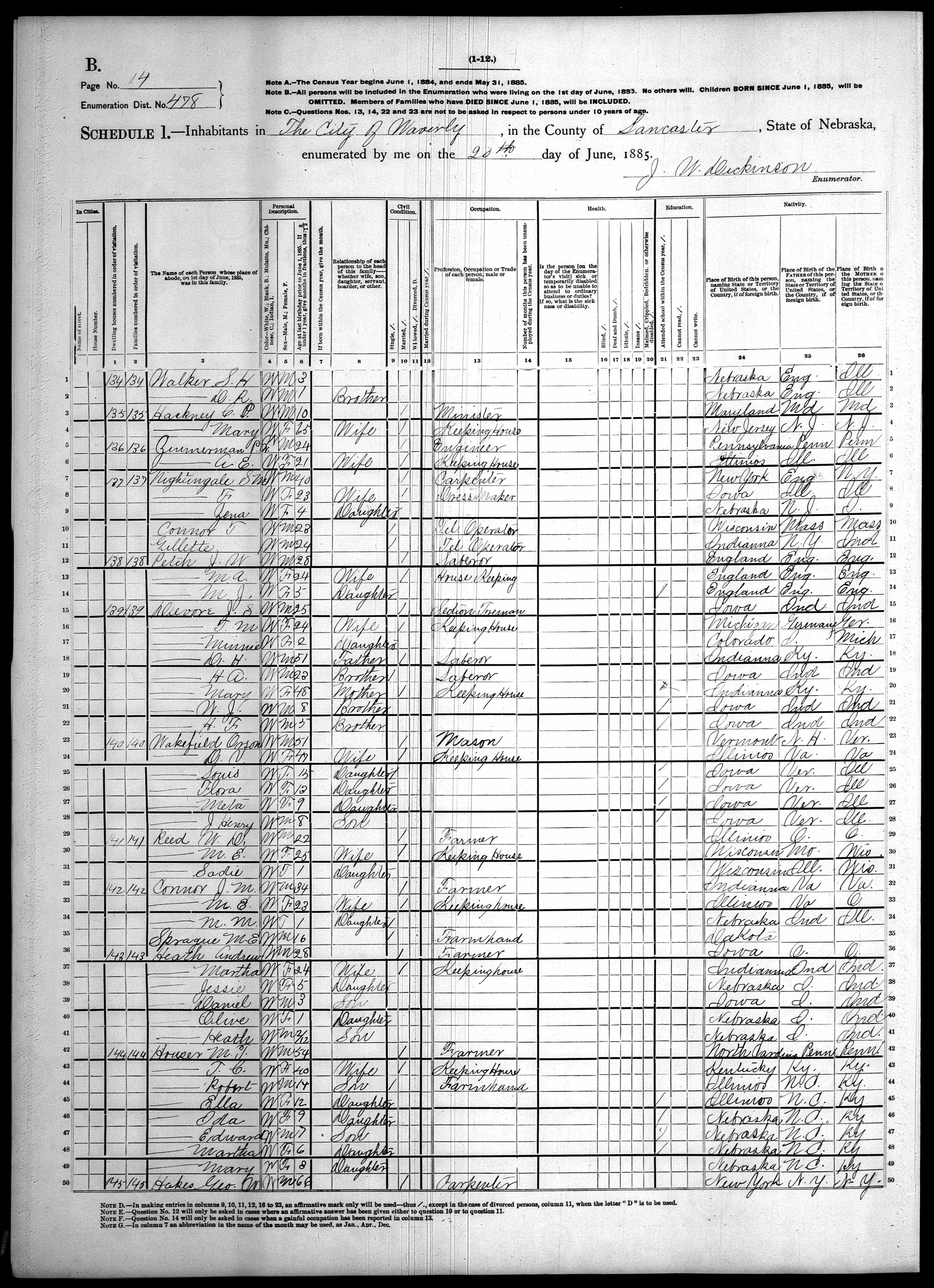 6604. “Nebraska State Census,” 1885, NE, Lancaster, Waverly, 14B, 478, M352, 14, 256, June 20, 1885, J W Dickinson.