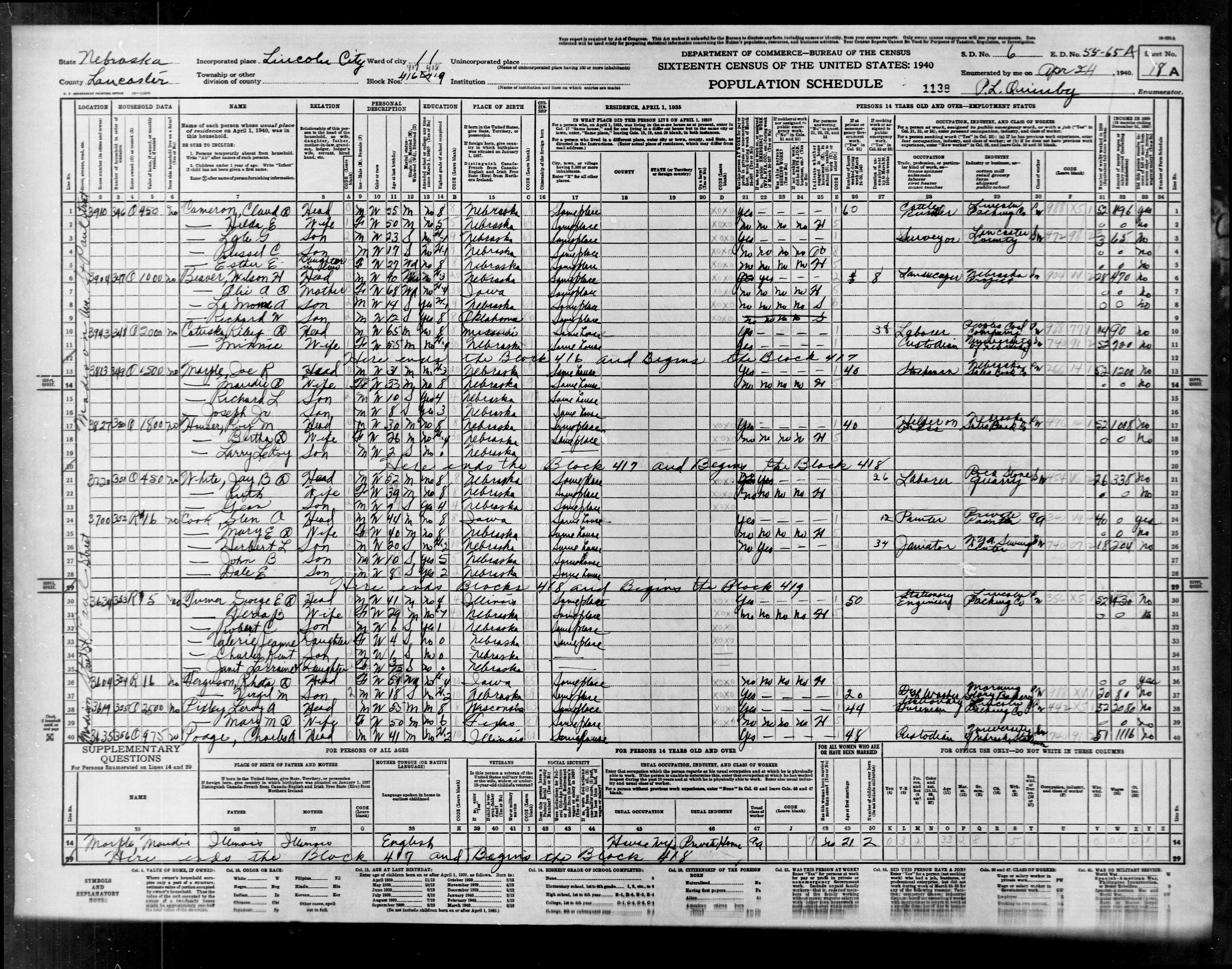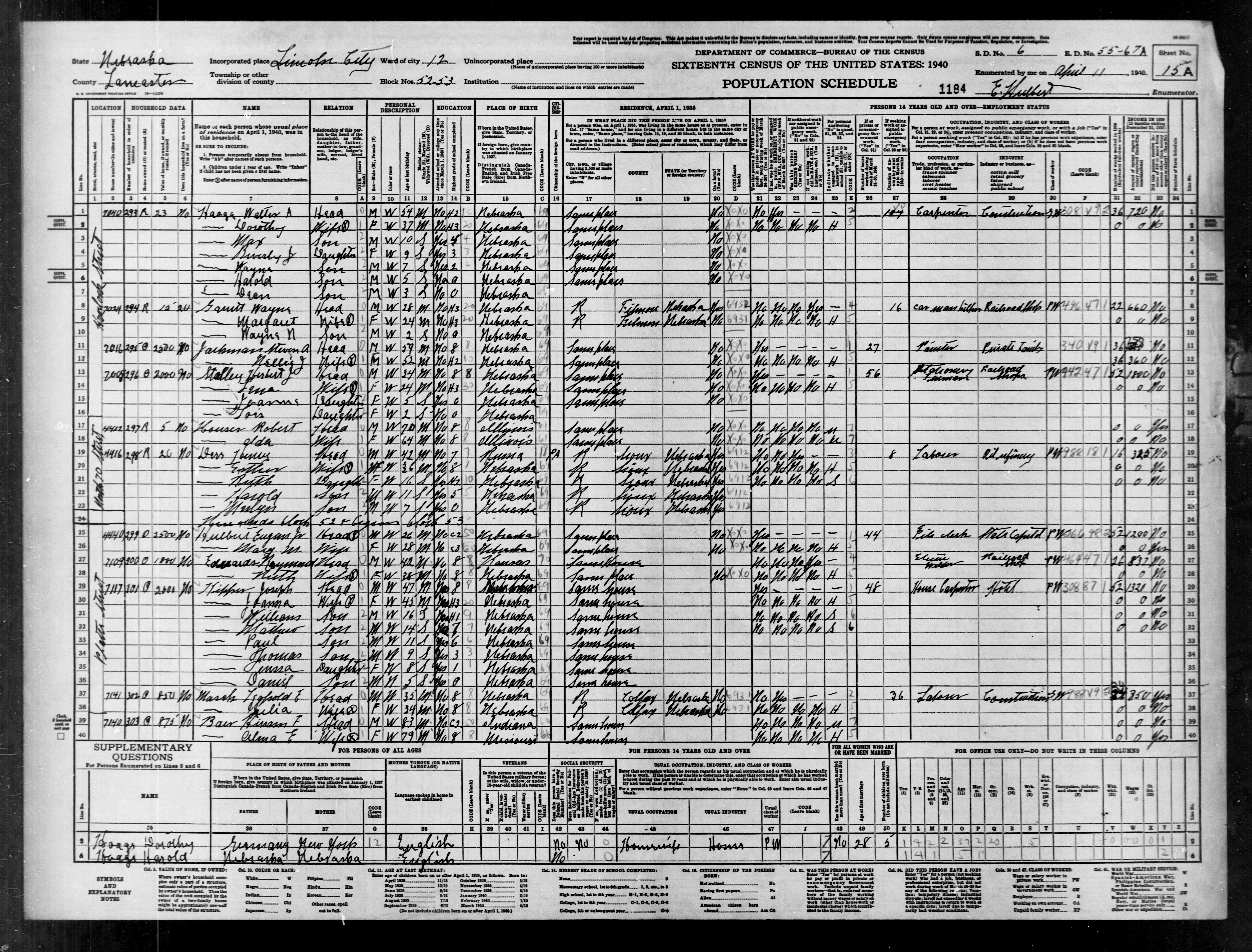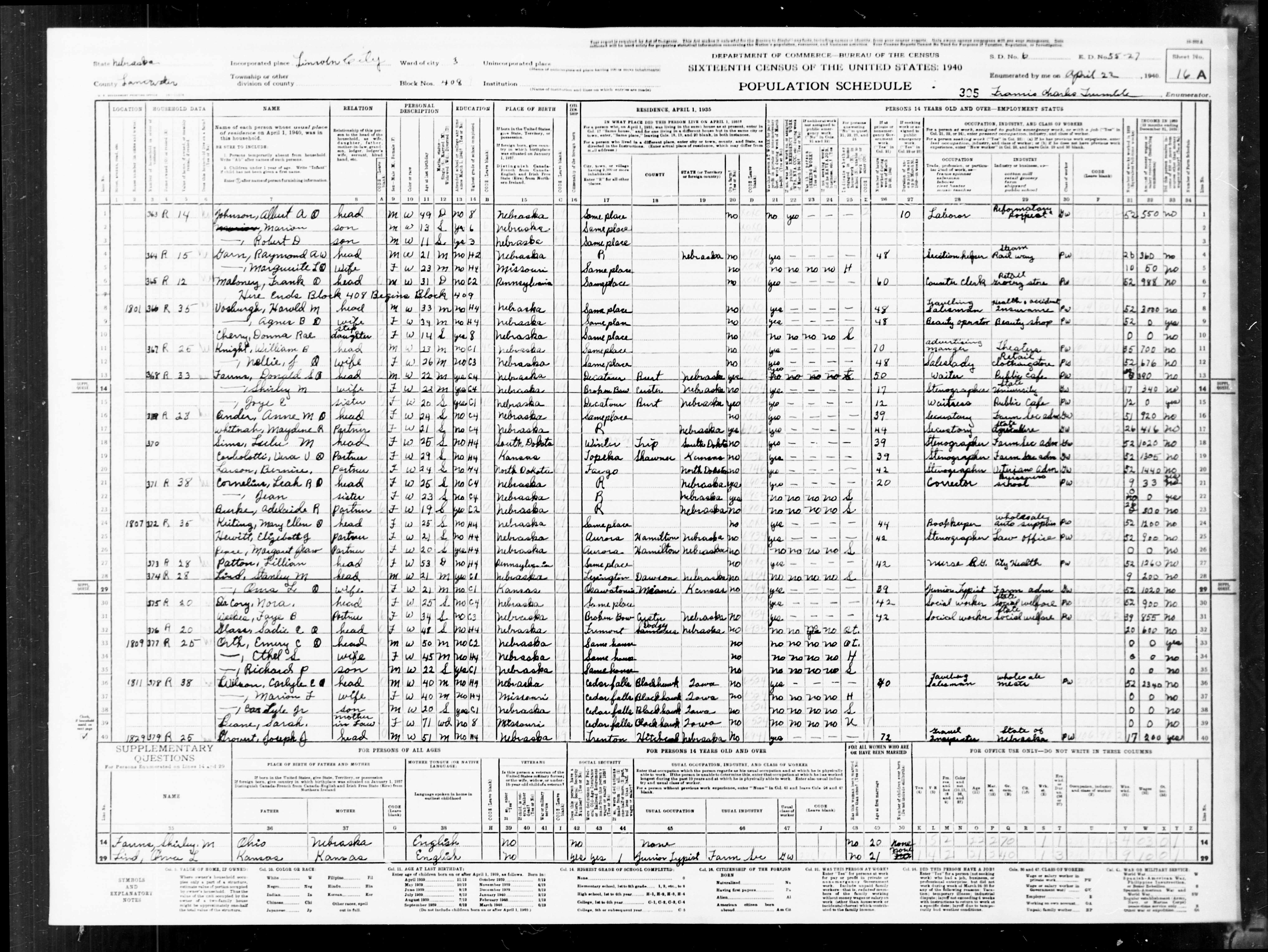 6606. “United States Census: 1940,” Bureau of the Census, US Dept. of Commerce, United States of America, 1940, NE, Lancaster, Lincoln, Ward 12, April 11, 1941, E Hulbert, 15A, 6, 55-67A, T627, 2255, 449.