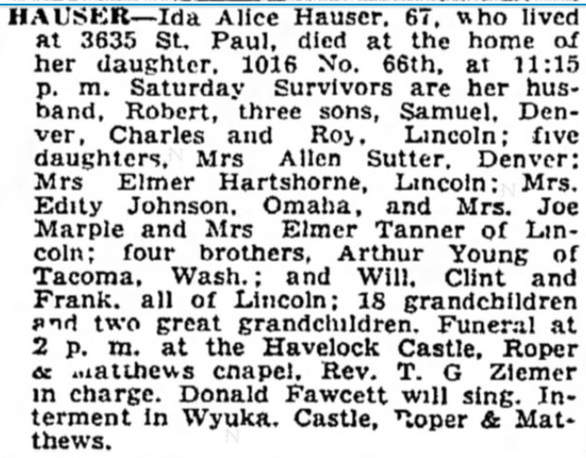 HAUSER—Ida Alice Hauser, 67, who lived at 3635 St. Paul, died at the home of her daughter, 1016 No. 66th, at 11:15 p. m. Saturday. Survivors are her husband, Robert, three sons, Samuel, Denver, Charles and Roy, Lincoln; five daughters, Mrs Allen Sutter, Denver: Mrs Elmer Hartshorne, Lincoln: Mrs. Edity Johnson, Omaha, and Mrs. Joe Marple and Mrs Elmer Tanner of Lincoln; four brothers, Arthur Young of Tacoma, Wash.; and Will, Clint and Frank, all of Lincoln; 18 grandchildren and two great grandchildren. Funeral at 2 p. m. Tuesday at Havelock Castle, Roper & Matthews chapel. Rev. T. G. Ziemer in charge. Donald Fawcett will sing. Interment in Wyuka. Castle, Roper & Matthews.