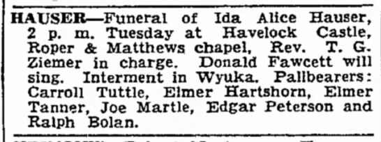 HAUSER—Funeral of Ida Alice Hauser, 2 p. m. Tuesday at Havelock Castle, Roper & Matthews chapel. Rev. T. G. Ziemer in charge. Donald Fawcett will sing. Interment in Wyuka. Pallbearers: Carroll Tuttle, Elmer Hartshorn, Elmer Tanner, Joe Martle, Edgar Peterson Ralph Bolan.