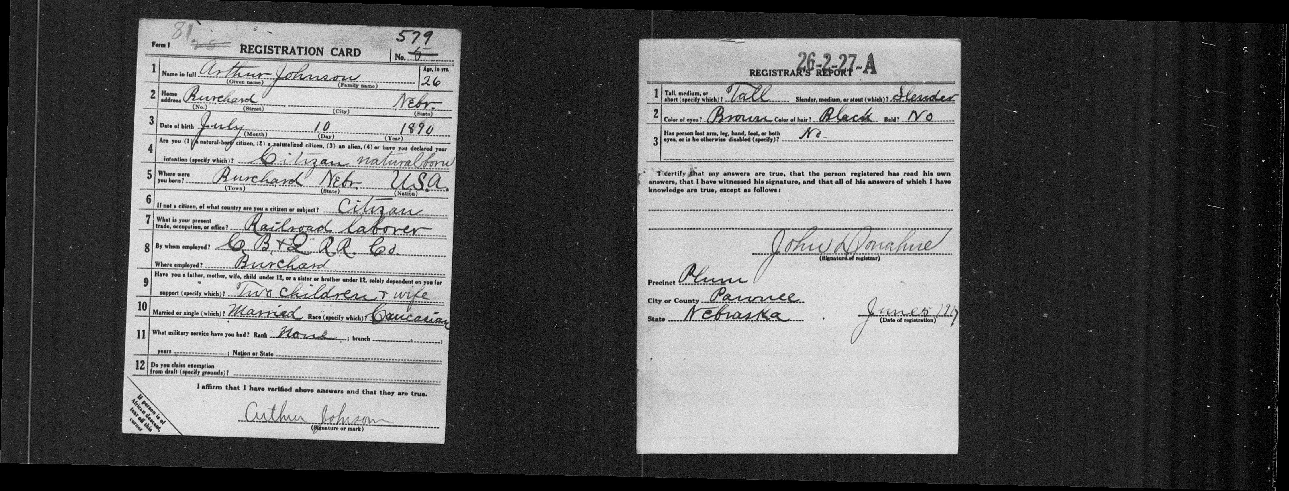 6615. Johnson, Arthur, World War I, 1917, NE, 579, “United States World War I Draft Registration Cards, 1917-1918,” June 5, 1917, Plum Creek, Pawnee County, NE, https://www.familysearch.org/ark:/61903/1:1:KZVQ-PXT.