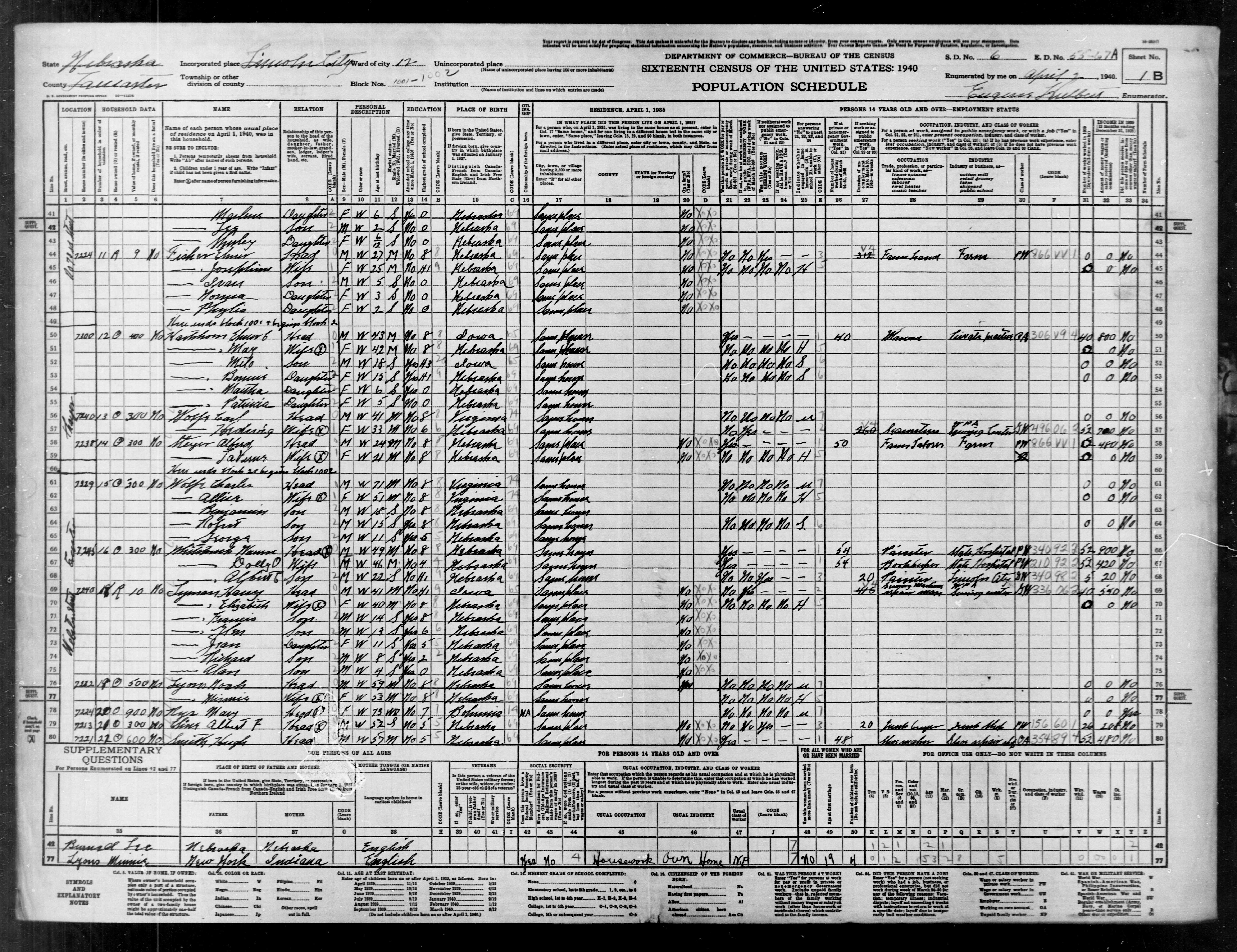 6636. “United States Census: 1940,” Bureau of the Census, US Dept. of Commerce, United States of America, 1940, NE, Lancaster, Lincoln, Ward 12, April 2, 1940, Eugene Hulbert, 1B, 6, 55-67, T627, 2255, 422.
