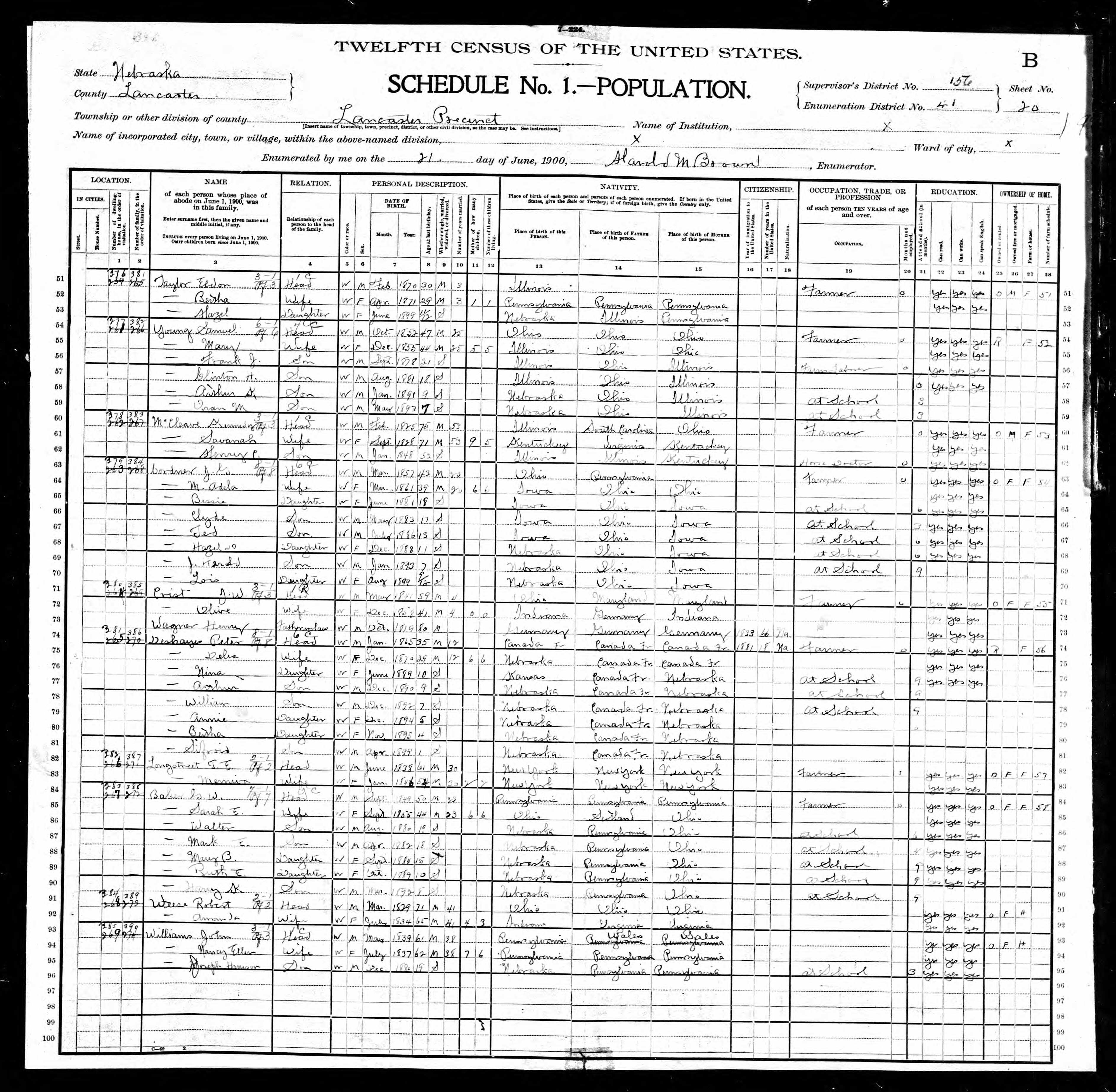 6667. “United States Census: 1900,” Bureau of the Census, US Dept. of Commerce, United States of America, 1900, NE, Lancaster, Lancaster Precinct, June 21, 1900, Harold M Brown, 20B, 156, 41, T623, 932.
