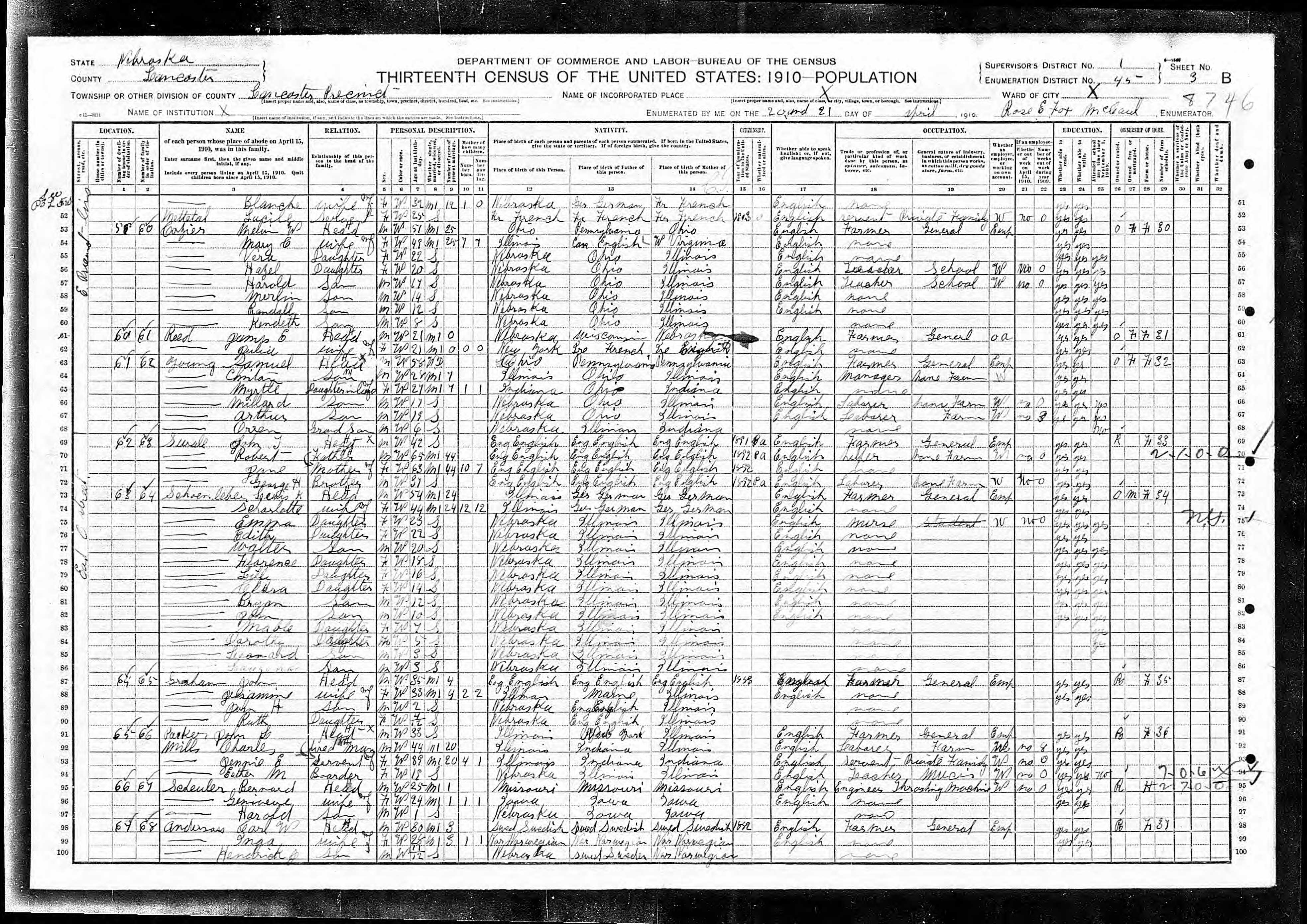 6668. “United States Census,” 1910, NE, Lancaster, Lancaster, 3B, 1, 45, T624, 849, Bureau of the Census, US Dept. of Commerce, United States of America, April 20, 1910, Rose E Fox McCaul.
