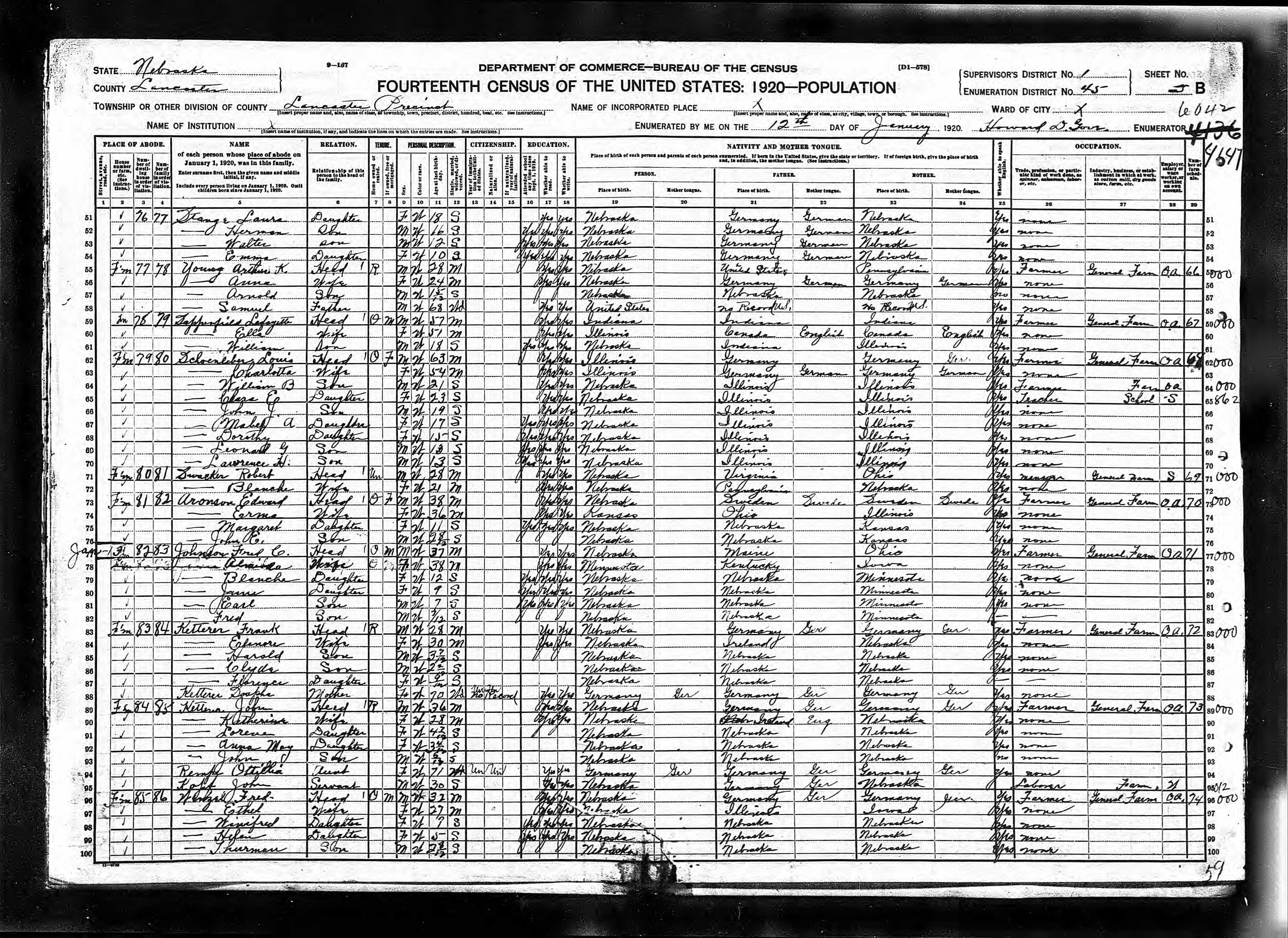 6669. “United States Census,” 1920, NE, Lancaster, Lancaster, 5B, 1, 45, T625, 995, 762, Bureau of the Census, US Dept. of Commerce, United States of America, January 12, 1920, Howard D Gore.
