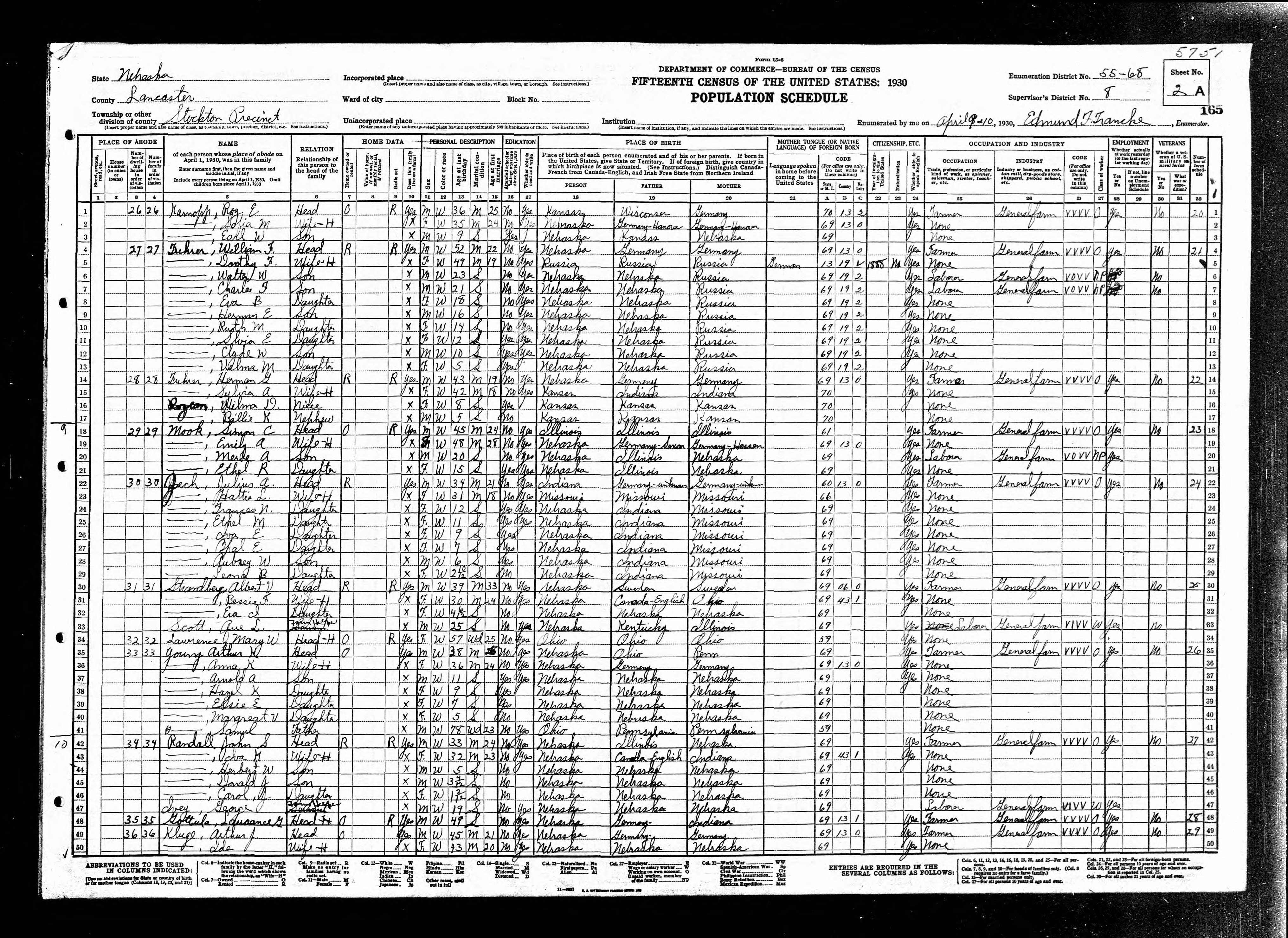 6670. “United States Census,” 1930, NE, Lancaster, Stockton, 2A, 8, 55-68, T626, 1286, 3, 819, Bureau of the Census, US Dept. of Commerce, United States of America, April 9, 1930, Edmund F Francke.