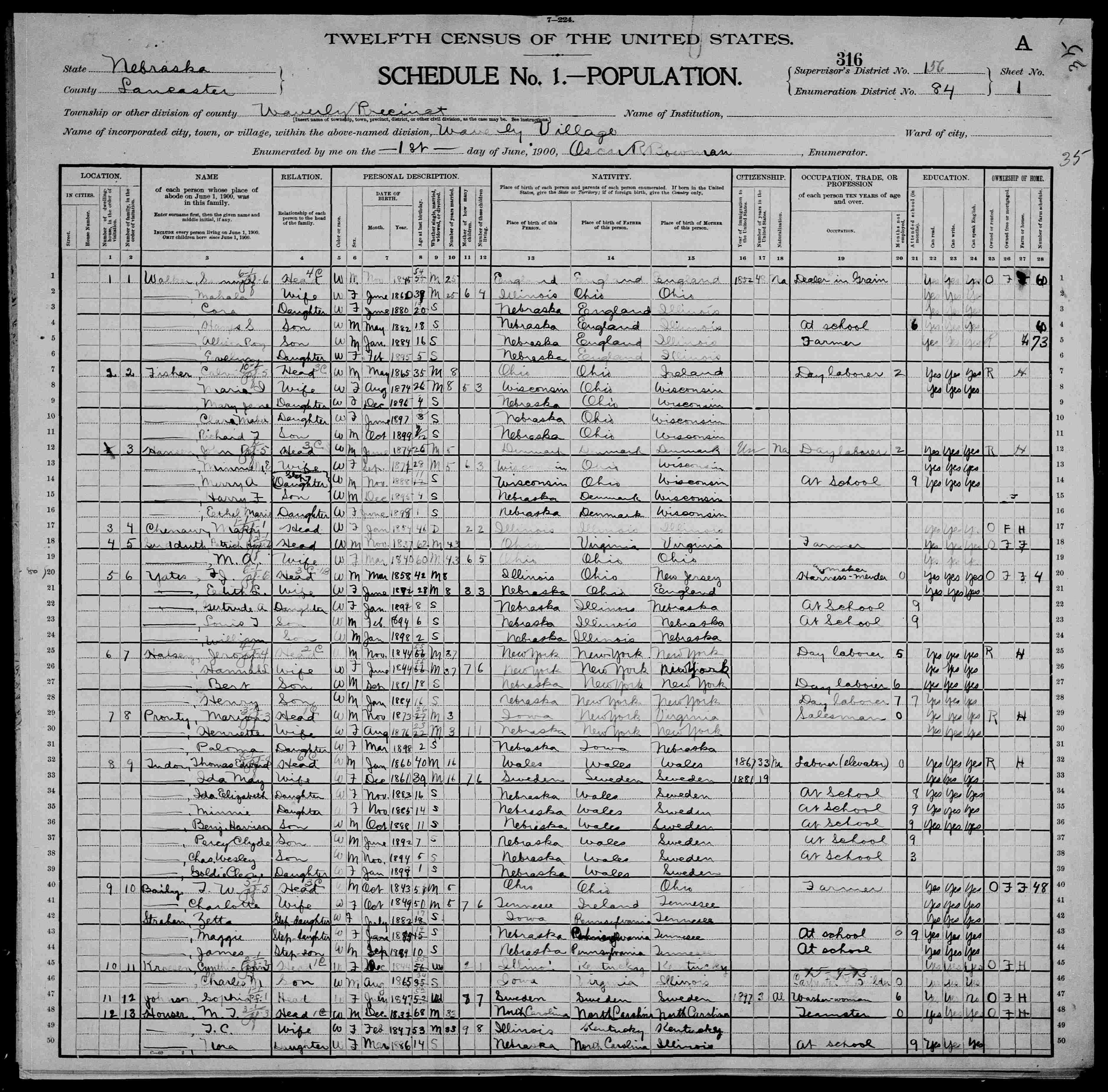 6680. “United States Census,” 1900, NE, Lancaster, Waverly, 1A, 1, 84, T623, 171, Bureau of the Census, US Dept. of Commerce, United States of America, June 1, 1900, Oscar R Bowman.