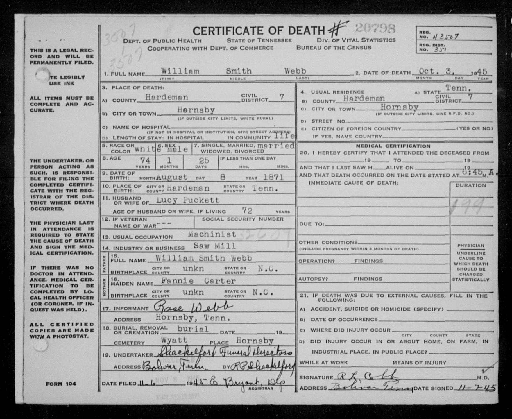6754. William Smith Webb, “Tennessee Death Records, 1914-1955,” Hornsby, Hardeman County, TN, USA, microfilm, digital folder number: 4184903-image number: 889-film number: 2137363-volume/page/certificate number: cn 20798, https://familysearch.org/pal:/MM9.1.1/N9LC-5T3.