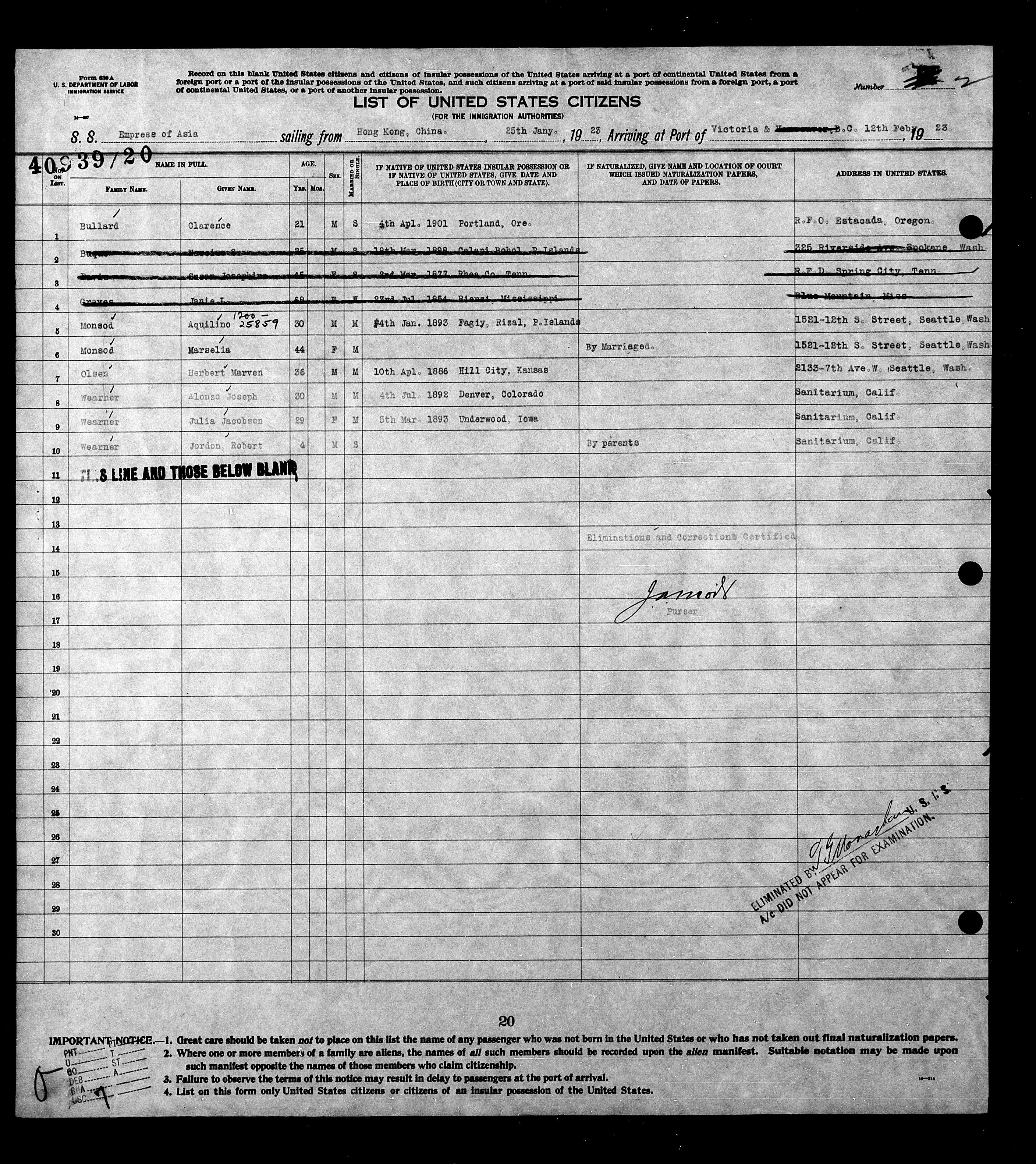 6773. Alonzo Wearner Family, “Washington, Seattle, Passenger Lists, 1890-1957,” February 12, 1923, Victoria, BC, https://www.familysearch.org/ark:/61903/1:1:KY23-LD4.