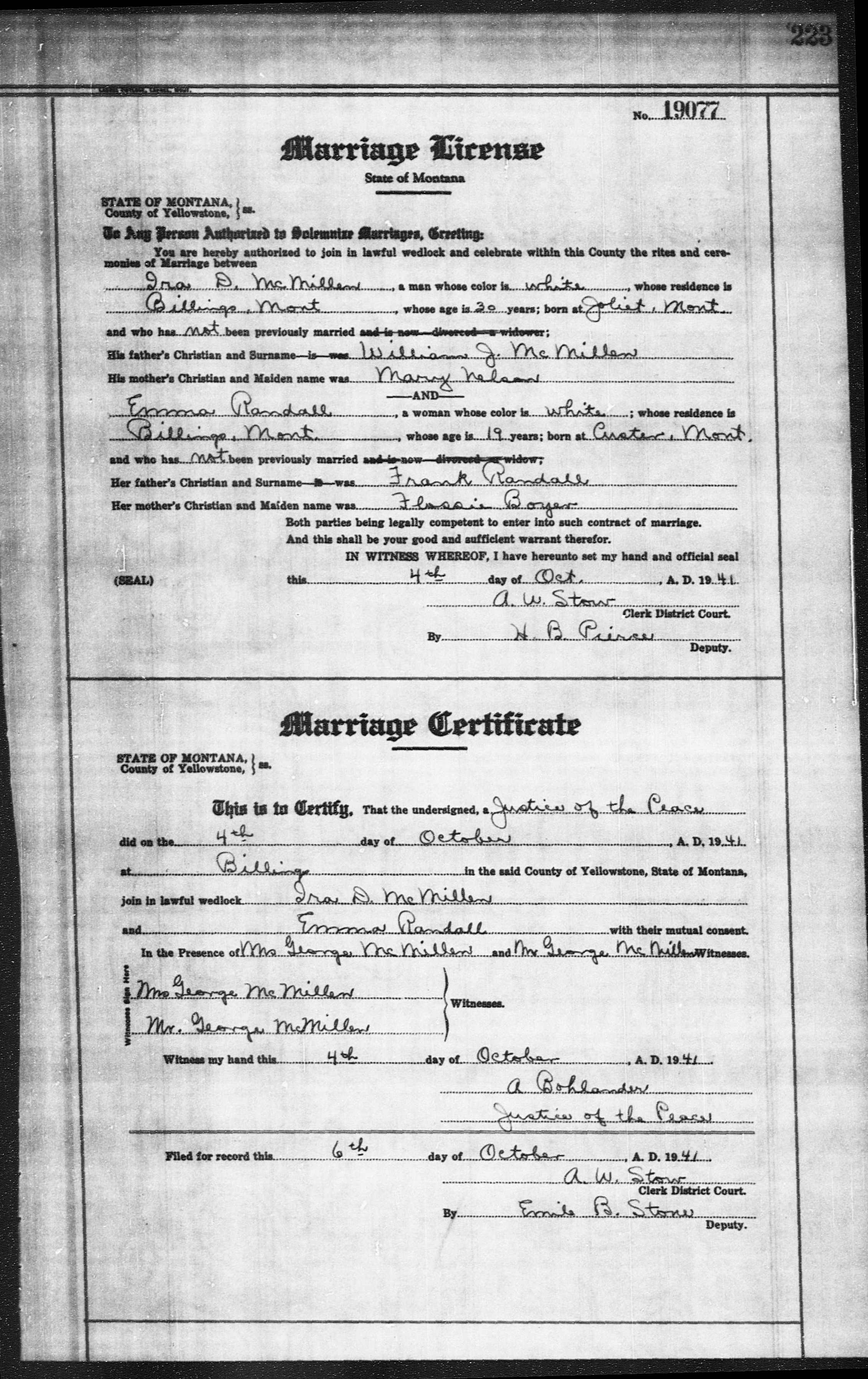 6777. “Montana, County Marriages, 1865-1950,” Ira D McMillen and Emma Randall, October 4, 1941, Billings, Yellowstone County, MT, USA, Reference ID: 19077-GS Film number: 1943767-Digital Folder Number: 4351494-Image Number: 1117, https://familysearch.org/pal:/MM9.1.1/F3W4-9NV.