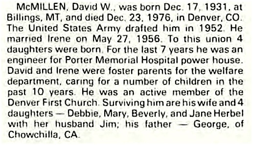 McMILLEN, David W., was born Dec. 17, 1931, at Billings, MT, and died Dec. 23, 1976 in Denver, CO. The United States Army drafted him in 1952. He married Irene on May 27, 1956. To this union 4 daughters were born. For the last 7 years he was an engineer for Porter Memorial Hospital power house. David and Irene were foster parents for the welfare department, caring for a number of children in the past 10 years. He was an active member of the Denver First Church. Surviving him are his wife and 4 daughters—Debbie, Mary, Beverly, and Jane Herbel with her husband Jim; his father—George, of Chowchilla, CA.