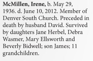 McMillen, Irene, b. May 29, 1936. d. June 10, 2012. Member of Denver South Church. Preceded in death by husband David. Survived by daughters Jane Herbel, Debra Wasmer, Mary Ellsworth and Beverly Bidwell; son James; 11 grandchildren.
