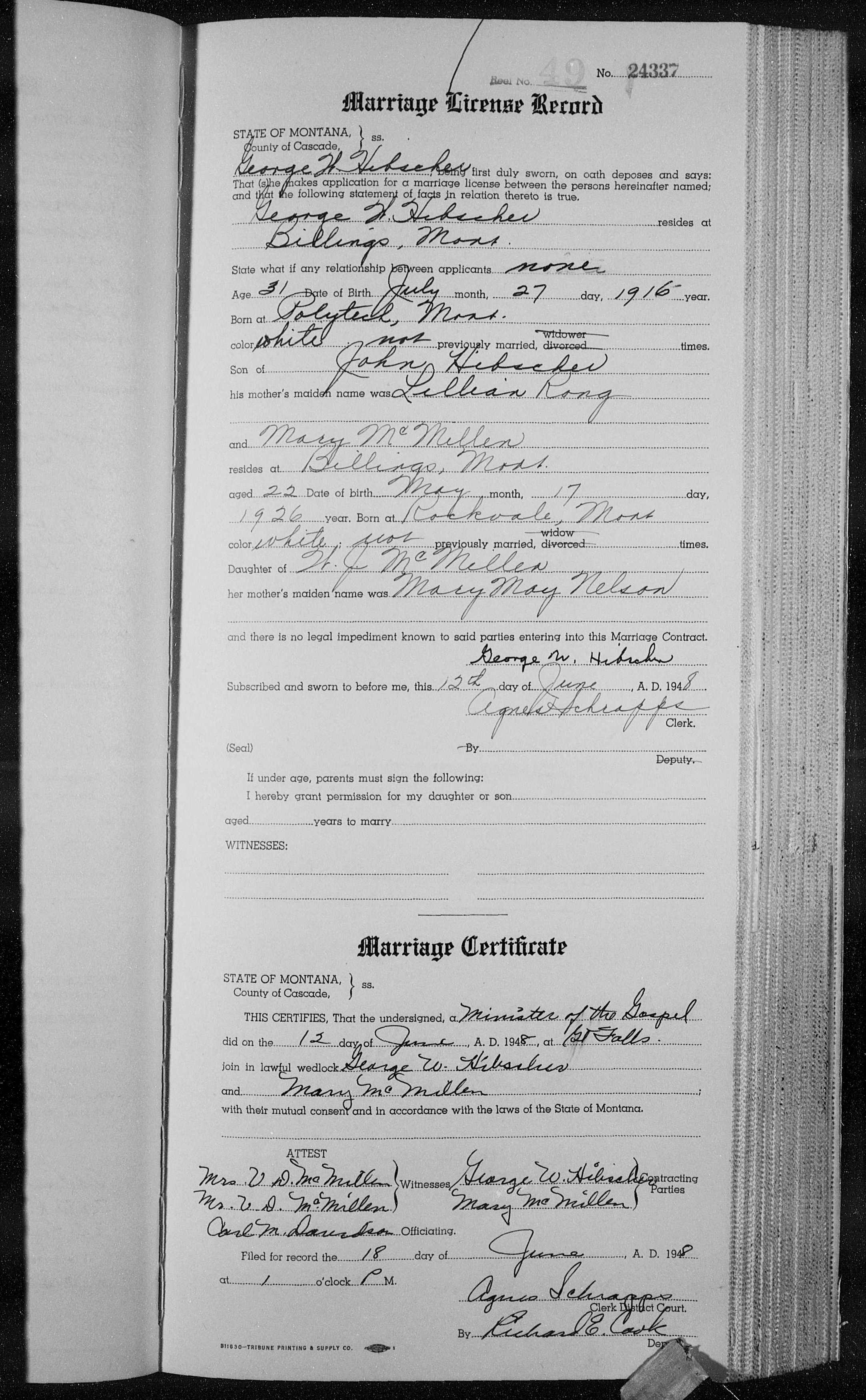 6799. “Montana, County Marriages, 1865-1950,” George W Hibscher and Mary McMillen, June 12, 1948, Great Falls, Cascade County, MT, USA, Reference ID: cn 24337-GS Film number: 1940304-Digital Folder Number: 4351419-Image Number: 98, https://familysearch.org/pal:/MM9.1.1/F3WG-LQT.
